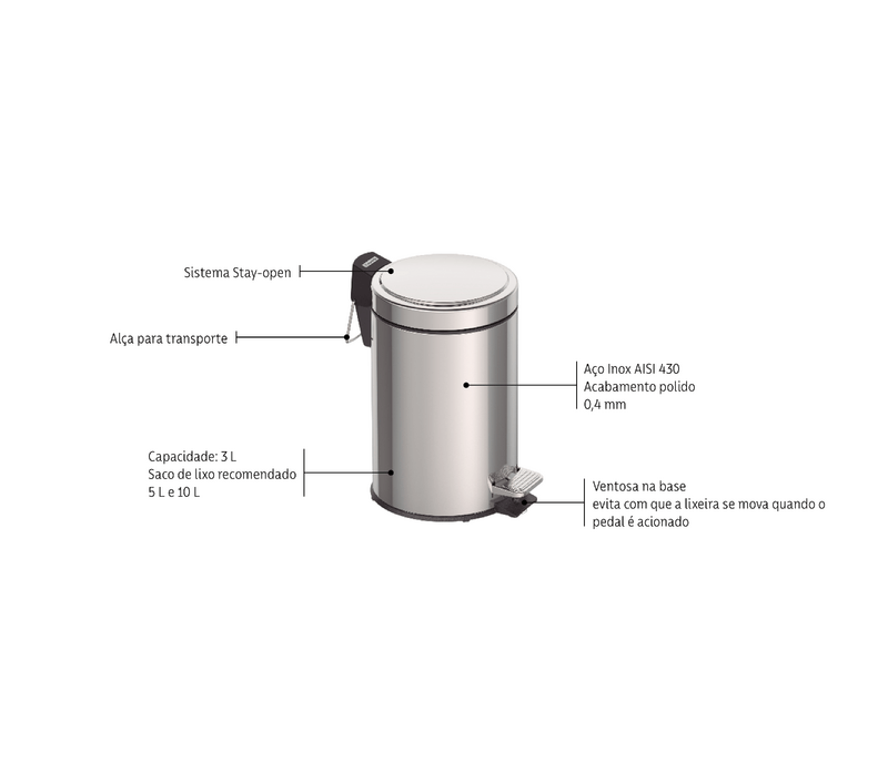 El día a día de su casa va a ser mucho más práctico con el basurero de acero inoxidable con pedal Tramontina con terminación pulida y balde interno de 3 l. Fabricado con materiales que garantizan sofisticación y funcionalidad, tiene capacidad de 3 l y es ideal para el ambiente de su elección. Fabricado en acero inoxidable con terminación pulida, es un producto con calidad brasileña. La tapa con gancho le asegura mayor resistencia al producto. La apertura por medio de pedal también es muy resistente, siendo posible el uso de 1 millón de ciclos (apertura y cierre). Tiene balde interno removible, (no tiene asa de transporte) y ventosa en la base que evita el movimiento del producto cuando se acciona el pedal. Un objeto moderno para las tareas diarias.