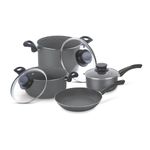 El juego contiene 1 olla 24cm, 1 cacerola 2 asas 20cm, 1 cacerola con mango 18cn,1 sartén 24cm.