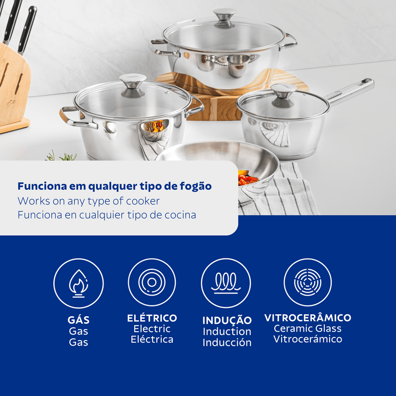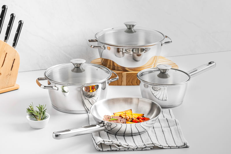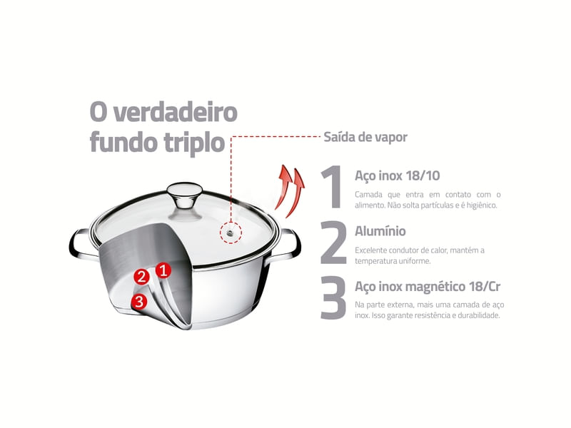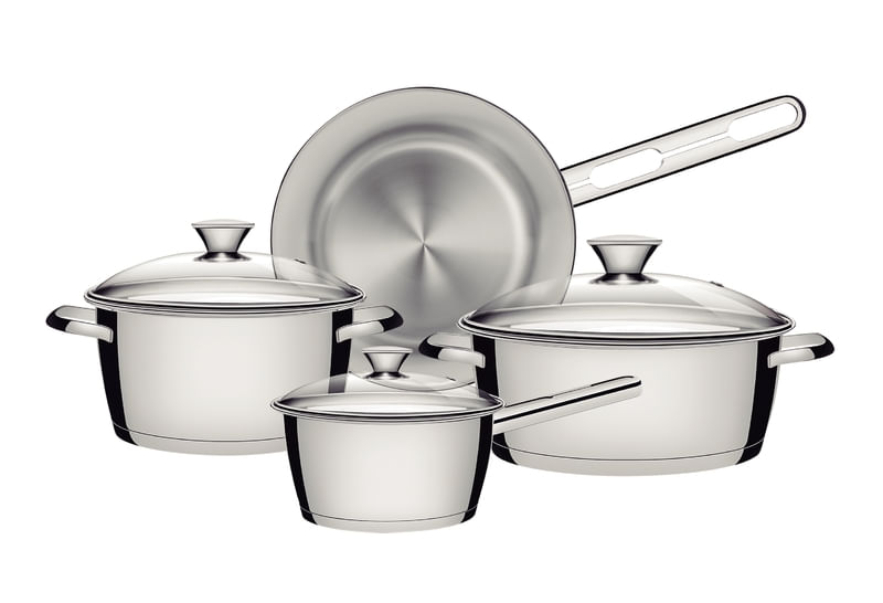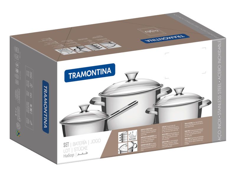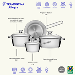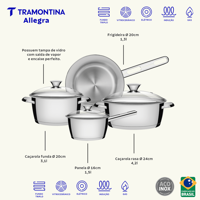 Tenga productos prácticos y diferenciados en su cocina. La batería de cocina Allegra de acero inoxidable con fondo triple de 4 piezas Tramontina, facilita su día a día y además embellece su cocina. Son 4 piezas con un diseño moderno que le da un toque de elegancia al ambiente. También cuenta con tecnología de fondo triple (acero inoxidable + aluminio + acero inoxidable), que distribuye mejor el calor, proporcionando una cocción más rápida y uniforme, y lo mejor, ahorrando energía. Las piezas están hechas de acero inoxidable, material que certifica alta durabilidad y buen gusto. Viene con una tapa con salida de vapor y además son muy fáciles de limpiar, se pueden lavar diariamente en el lavavajillas. Estas piezas impresionan por su versatilidad, se pueden utilizar en diferentes tipos de cocinas.