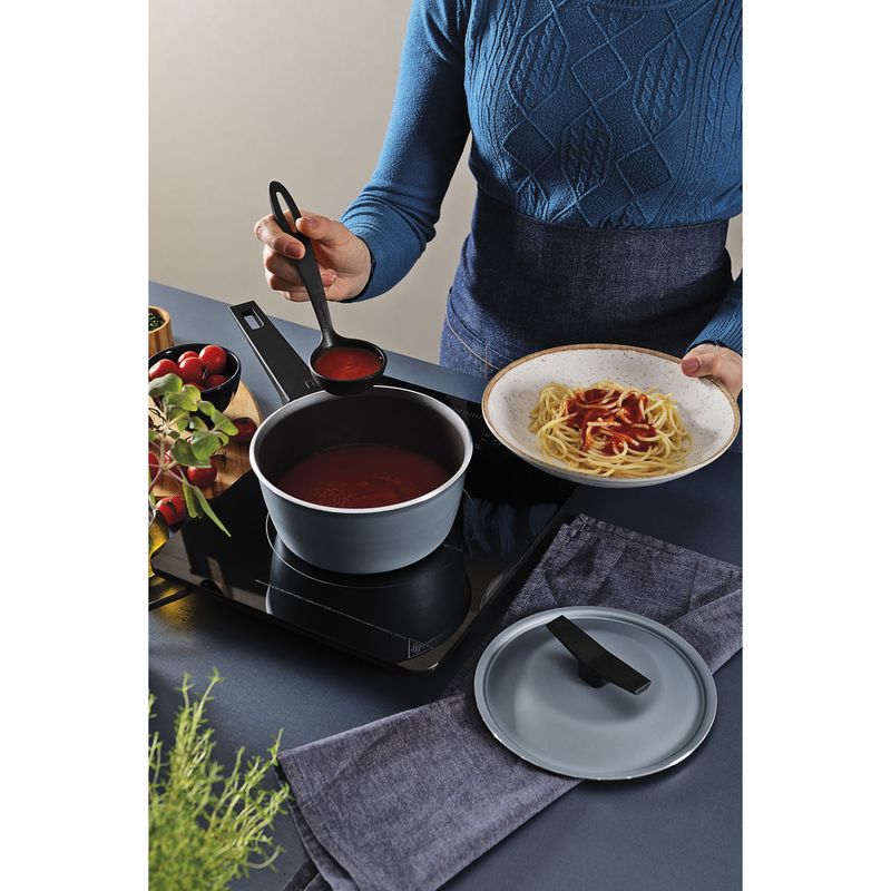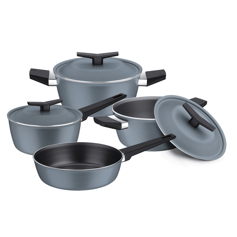 La batería de cocina Spezia Induction Tramontina de Aluminio con Revestimiento Antiadherente Starflon Excellent azul ardosia de 4 pzas aporta más practicidad y comodidad a su cocina. Con un cuerpo de aluminio de 3 milímetros ofrece una cocción rápida y uniforme de los alimentos. Sus tapas de aluminio son ligeras y fáciles de manipular mientras que los mangos y asas de baquelita con acabado soft touch aportan un toque suave y confortable. Compatible con cocinas a gas eléctricas vitrocerámicas y de inducción es la elección ideal para quienes buscan calidad y modernidad. Incluye: 1 Cacerola Ø 20 cm 2,4 L, 1 Cacerola Ø 24 cm 4,3 L, 1 Olla Ø 18 cm 1,9 L, y 1 Sartén Honda Ø 24 cm 2,5 L.