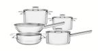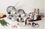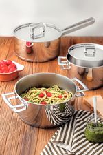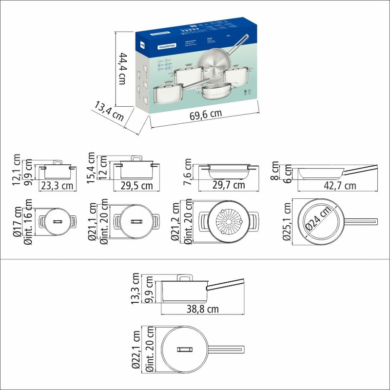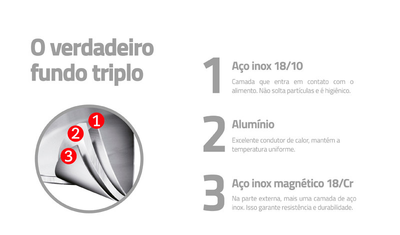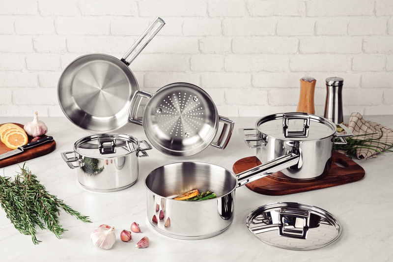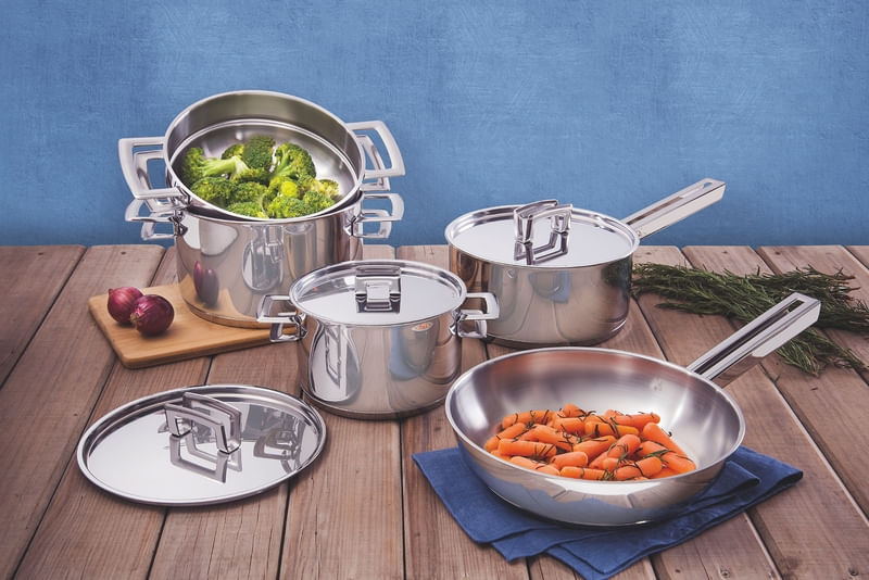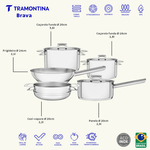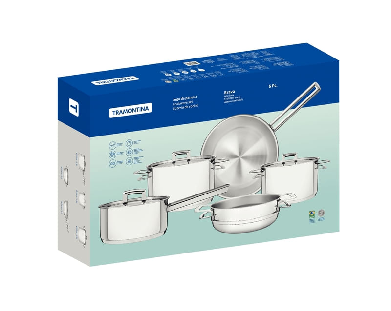 La Batería de cocina Tramontina de Acero Inoxidable Fondo Triple con Tapa Plana 5 Piezas es ideal para quien aprecia la mezcla de rasgos modernos con la elegancia del acero inoxidable para dejar su cocina linda. Las ollas de la línea Brava poseen fondo triple, una capa de aluminio revestida por dos de acero inoxidable, que ayuda a distribuir mejor el calor y permite ahorrar tiempo y energía, manteniendo la temperatura de la comida por más tiempo. Pueden ser usadas en cualquier tipo de cocina y lavadas diariamente en lavavajillas. La Batería de cocina es perfecta para quien le encanta funcionalidad y belleza en su cocina.