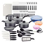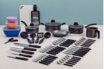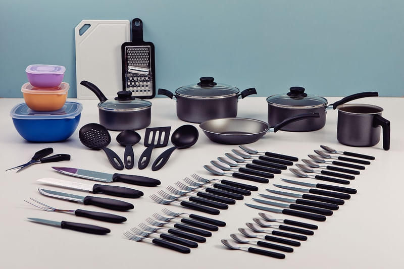¡Todo lo que necesita para preparar comidas con éxito, lo encontrará en la batería de cocina Tramontina en aluminio con revestimiento interno y externo antiadherente Starflon Max plomo de 56 piezas! Desarrollado para personas que aman la rutina en la cocina, tiene piezas producidas con un cuerpo en aluminio con espesor especial y revestimiento en antiadherente Starflon Max. Estas características ofrecen una cocción rápida y uniforme de los alimentos, y evitan que se peguen en la superficie. Las asas y los mangos son de baquelita y los agarradores de nylon. Estos materiales antitérmicos no calientan y garantizan seguridad necesaria para el manejo. Sus ollas y cacerolas incluyen tapas de vidrio templado con bordes de acero inoxidable, que ayudarán y facilitarán la observación de sus recetas durante la preparación, haciendo que la hora de cocinar sea mucho más práctica. También incluye utensilios de nylon, cubiertos y cuchillos con láminas de acero inoxidable y mangos de polipropileno. ¡Un kit Tramontina pensado especialmente para usted y para completar su cocina!