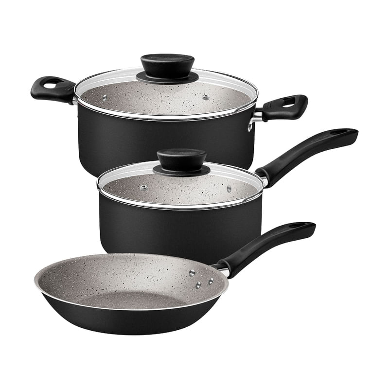 La batería de cocina Tramontina Linz en aluminio con revestimiento interno y externo en antiadherente Starflon Max negro de 3 piezas es la elección ideal para quienes buscan practicidad y eficiencia en la cocina. Con piezas fabricadas en aluminio de elevada calidad, permite una cocción rápida y uniforme, además de evitar que los alimentos se peguen. Las tapas de vidrio templado con bordes de acero inoxidable permiten controlar la preparación sin perder el aroma, mientras que los mangos y asas de baquelita y nylon ofrecen seguridad y comodidad. Compatible con cocinas a gas, eléctricas y vitrocerámicas, también es apta para el lavavajillas y aporta más facilidad a su día a día.