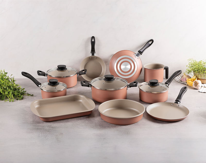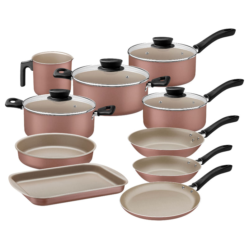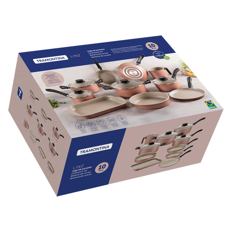La batería de cocina Tramontina Linz en aluminio con revestimiento interno y externo en antiadherente Starflon Max mocaccino 10 piezas es la opción ideal para quien busca un juego completo y funcional. Con diferentes formatos y capacidades, satisface las más variadas necesidades en la cocina. Las piezas son producidas en aluminio con revestimiento antiadherente, que proporciona cocción uniforme, evita que los alimentos se peguen y facilita la limpieza. Los mangos y asas antitérmicos garantizan seguridad durante el uso, y las tapas de vidrio templado con bordes de acero inoxidable ayudan a acompañar la preparación. Un juego versátil para hacer que el día a día sea más práctico.