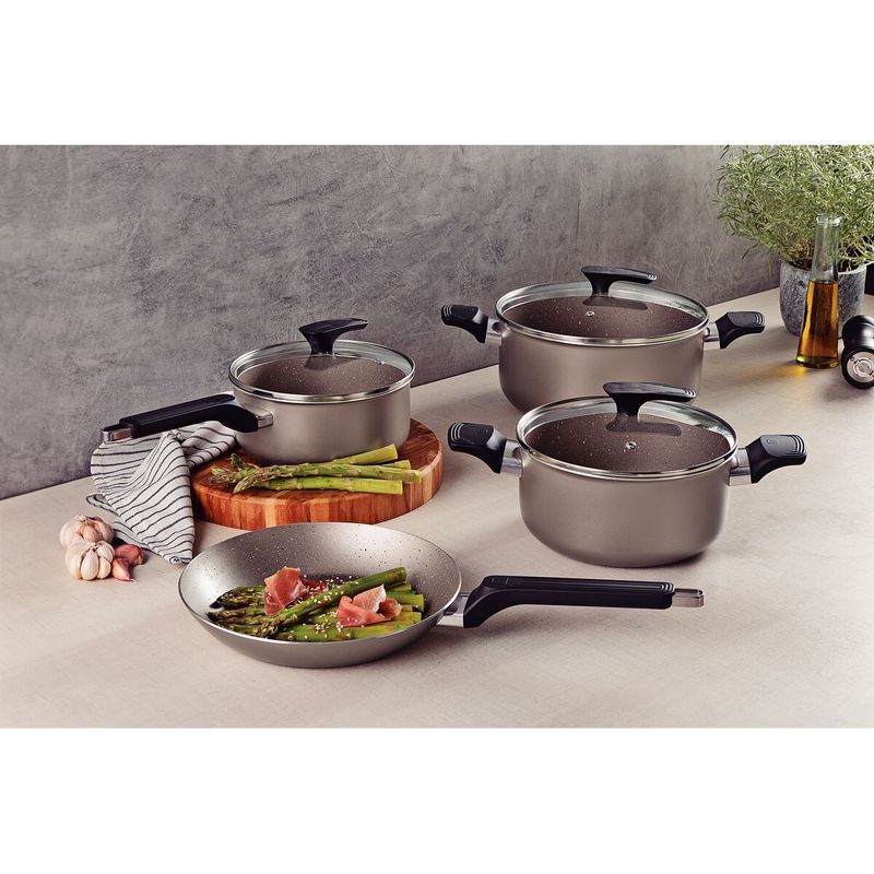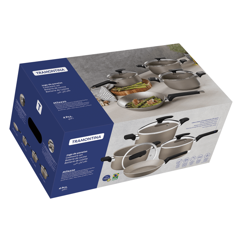 La batería de cocina Tramontina Milazzo en aluminio con revestimiento interno y externo en antiadherente Starflon Max almendra de 4 piezas es la elección ideal para equipar su cocina con estilo y eficiencia. Fabricadas en aluminio con revestimiento antiadherente de Starflon Max, aseguran durabilidad y facilidad en la limpieza, evitando que los alimentos se peguen. Los mangos y asas de baquelita antitérmica con acabado softtouch brindan confort y seguridad durante el uso. Incluye tapas de vidrio templado con salida de vapor y bordes de acero inoxidable, que permiten visualizar la preparación de los alimentos sin perder calor. Se pueden utilizar en cocinas a gas, eléctricas y vitrocerámicas, lo que ofrece una gran versatilidad. Transforme sus experiencias culinarias con la calidad y la innovación de Tramontina!