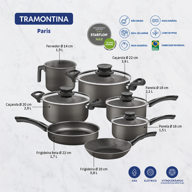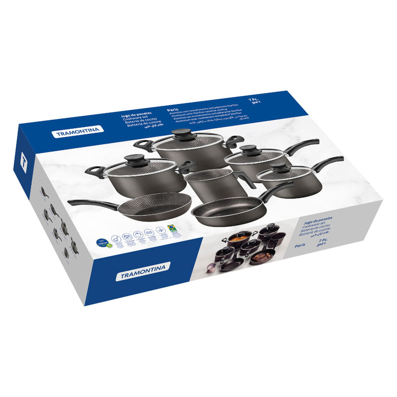 ¡Encontrará los elementos esenciales para su cocina en la batería de cocina Tramontina Paris en aluminio con revestimiento interno y externo con antiadherente Starflon Max plomo de 7 piezas! Fabricadas en aluminio con revestimiento interno y externo de antiadherente Starflon Max, las piezas que componen el juego proporcionan una cocción rápida y uniforme de los alimentos y evitan que se peguen la superficie. Sus mangos y asas son de baquelita antitérmica y los agarradores son de nylon, dos materiales que no se calientan y ofrecen un manejo muy cómodo y seguro. Además, son muy fáciles de limpiar y aptas para lavavajillas. ¡Un juego que completará su cocina con más calidad y estilo!