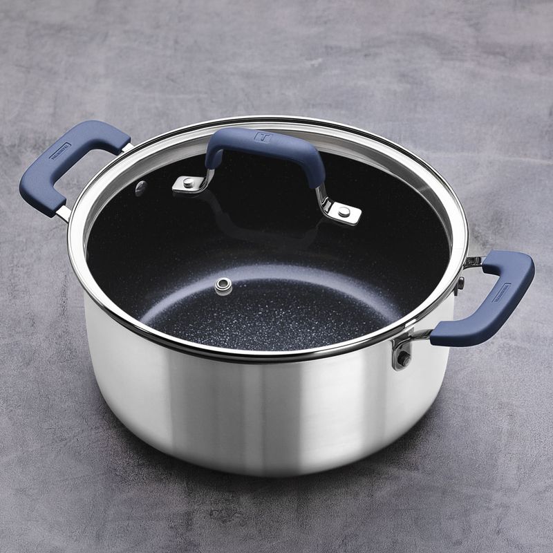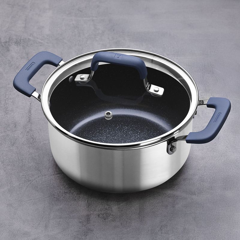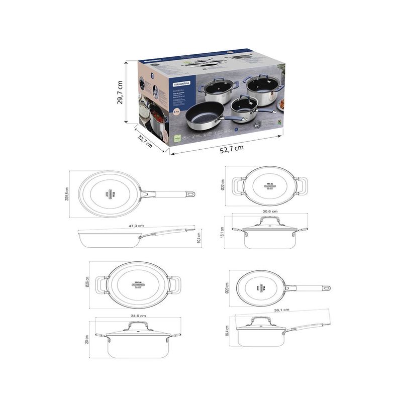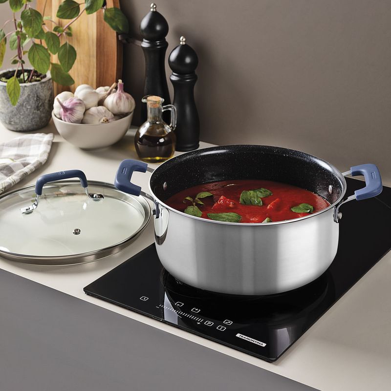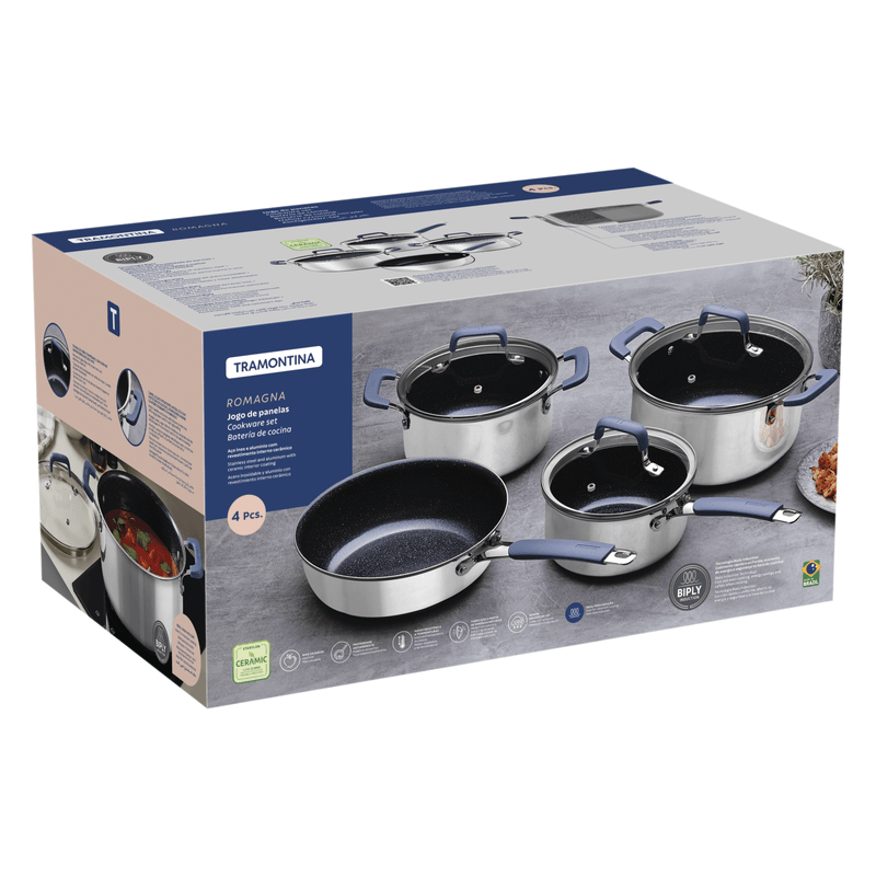 La batería de cocina Tramontina Romagna en acero inoxidable y aluminio con revestimiento interno cerámico Black Stone con 4 piezas es la elección perfecta para quienes buscan desempeño y estilo en la cocina. Las piezas que componen el juego son: 1 sartén honda de 24 cm, 1 olla de 18 cm y 2 cacerolas una de 20 cm y otra de 24 cm. Con tecnología Biply Induction, que combina acero inoxidable y aluminio, este juego permite una cocción rápida y uniforme, además de ahorrar energía y seguridad a la hora de cocinar. El revestimiento cerámico facilita la limpieza y ofrece más practicidad en la rutina diaria. Fabricadas en aluminio de elevada resistencia, que garantiza una excelente distribución del calor, cocinan los alimentos de forma uniforme y eficiente. La capa de acero inoxidable ayuda a calentar de forma rápida y económica, lo que las hace compatibles con todo tipo de cocinas: de inducción, a gas, eléctricas y vitrocerámicas (resistencia eléctrica). El diseño moderno de las piezas incluye mangos con protección de silicona que proporcionan más seguridad y confort durante el uso. Transforme su experiencia en la cocina con la batería de cocina Tramontina Romagna!