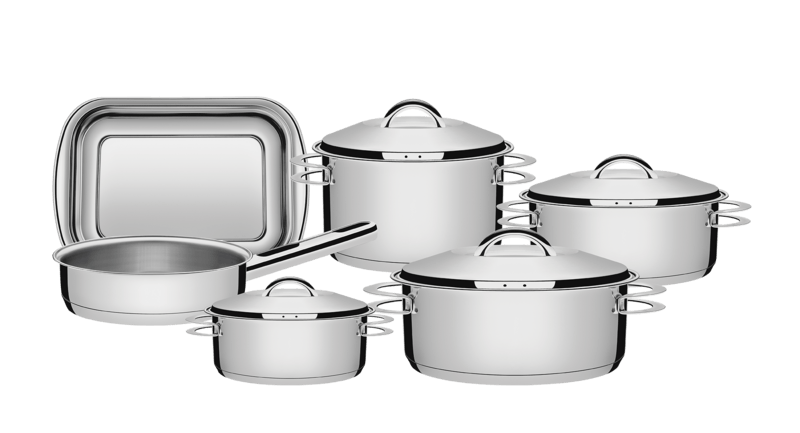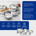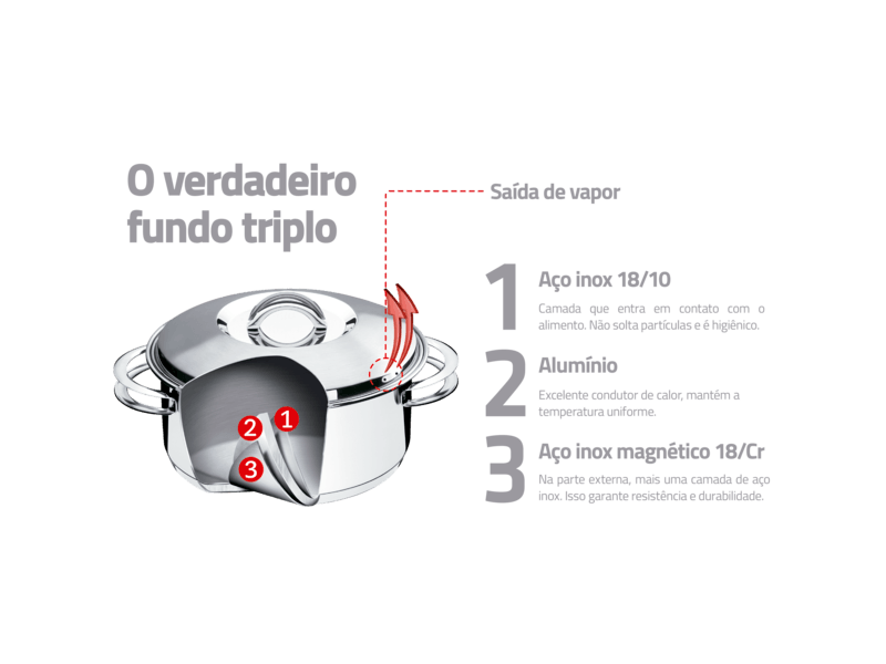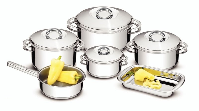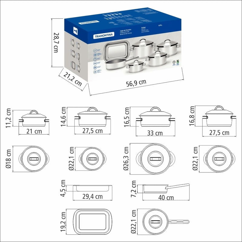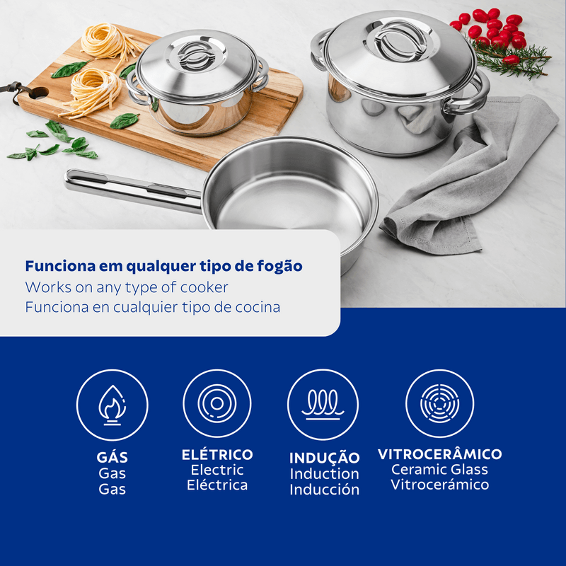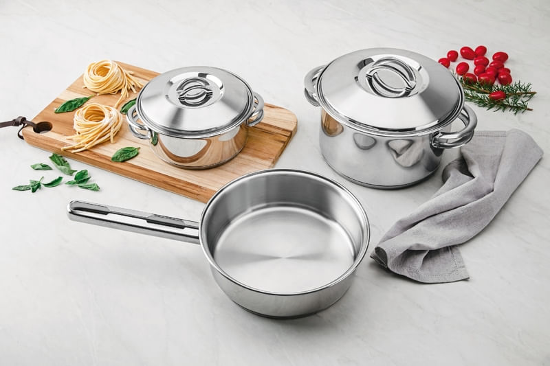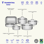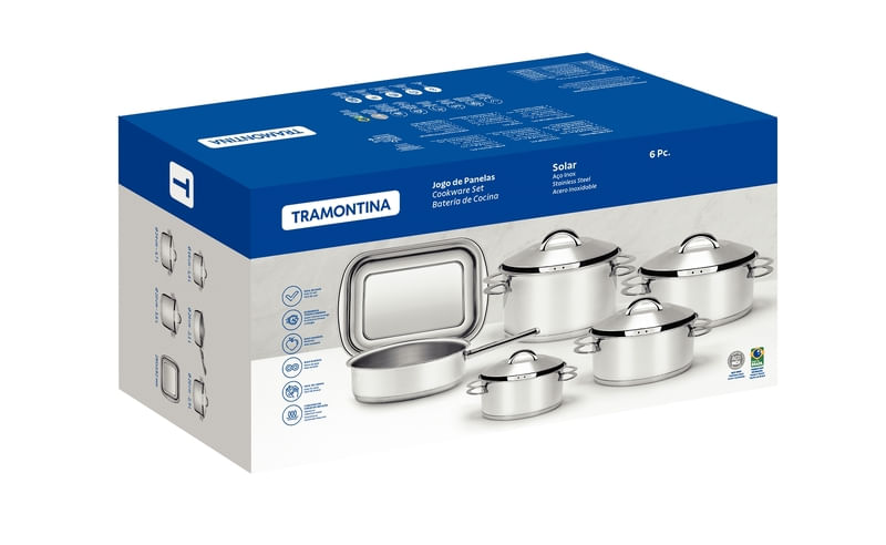 Tramontina es sinónimo de durabilidad y practicidad. La batería de cocina Tramontina de acero inoxidable fondo triple 6 piezas de la línea Solar une elegancia con seguridad. Totalmente hecha de acero inoxidable, no suelta residuos en los alimentos y su fondo triple (acero inoxidable + aluminio + acero inoxidable) distribuye el calor uniformemente, proporcionando una cocción más rápida, ahorrando energía y dejando los alimentos calientes por más tiempo. Fáciles de limpiar y altamente durables, las ollas pueden lavarse diariamente y ser utilizadas en todas las cocinas. ¡La batería de cocina Tramontina de acero inoxidable fondo triple renovará y dará belleza a su cocina!