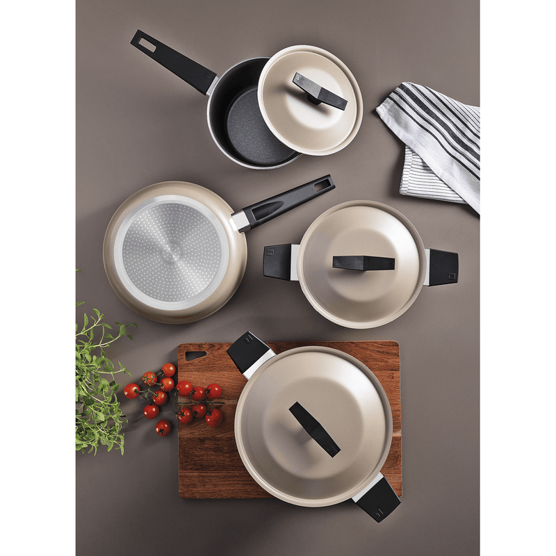 Incorpore un toque de sofisticación a su cocina con la batería de cocina Tramontina Spezia Inducción en aluminio con revestimiento interno y externo en antiadherente Starflon Excellent arena de 4 piezas. El revestimiento antiadherente Starflon Excellent facilita la limpieza, evita que los alimentos se peguen y sus piezas ofrecen una cocción uniforme. Los mangos de baquelita con acabado softtouch garantizan confort y seguridad. Versátil, el juego es compatible con cocinas a gas, eléctricas, vitrocerámicas y de inducción, además de ser perfecto para que su día a día sea más práctico.