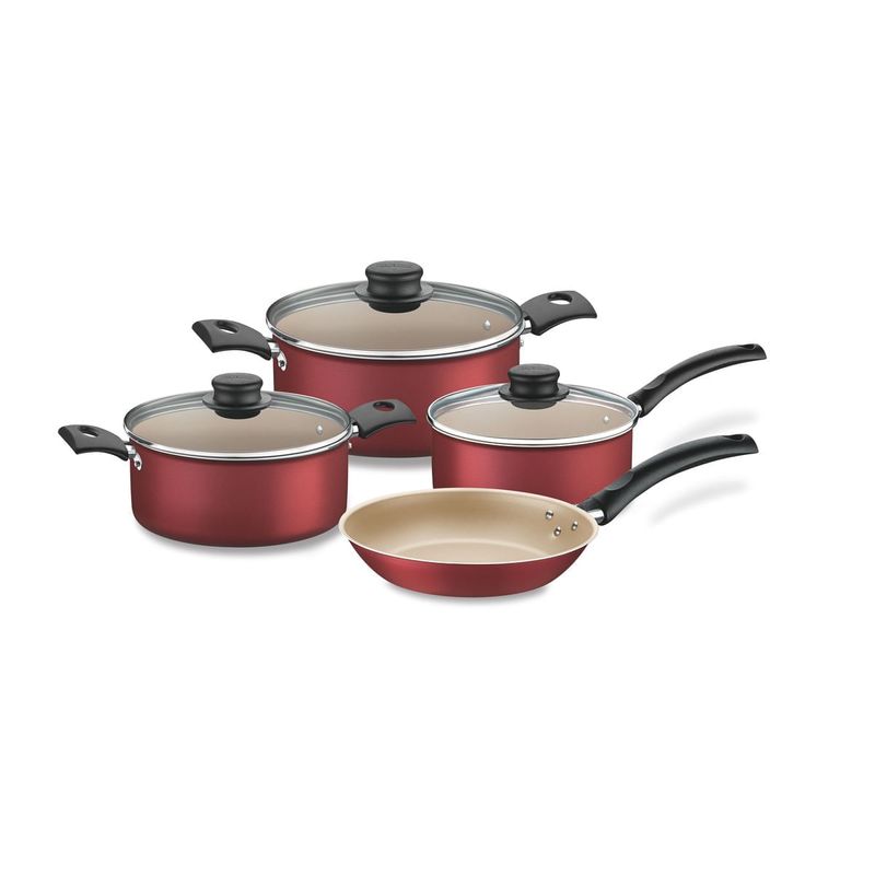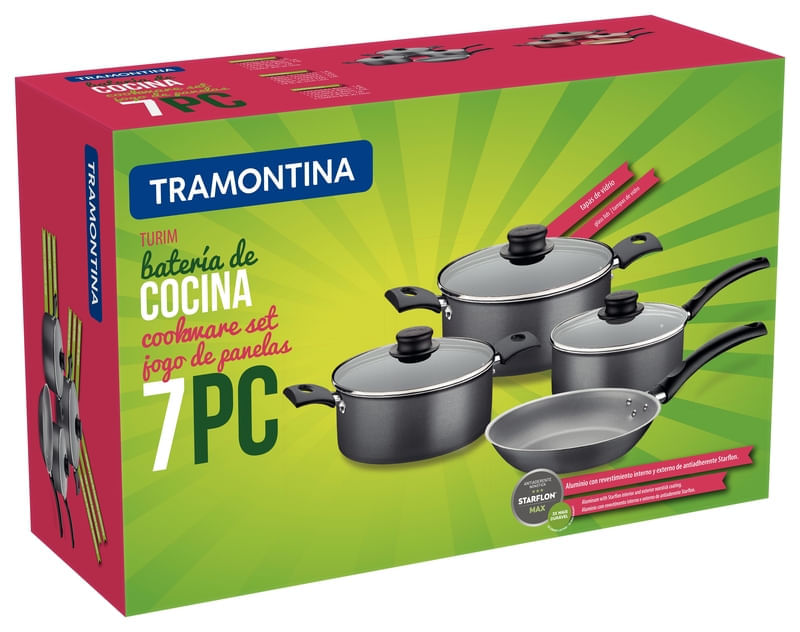 El juego contiene: 1 cacerola 2 asas 24cm, 1 cacerola 2 asas 20cm, 1 cacerola c/mango 18cm, 1 sartén 24cm, y tapas de vidrio templado.