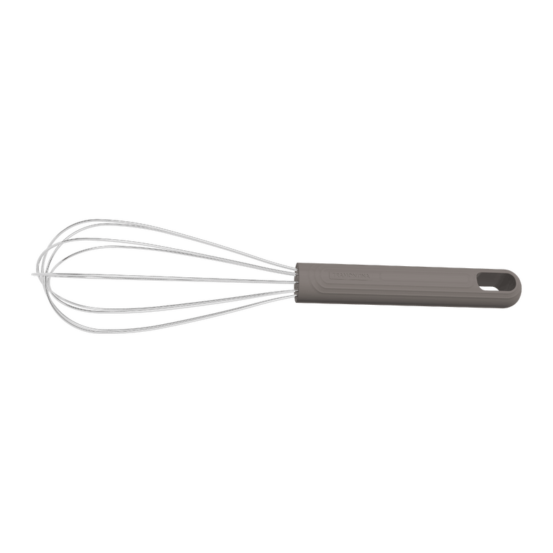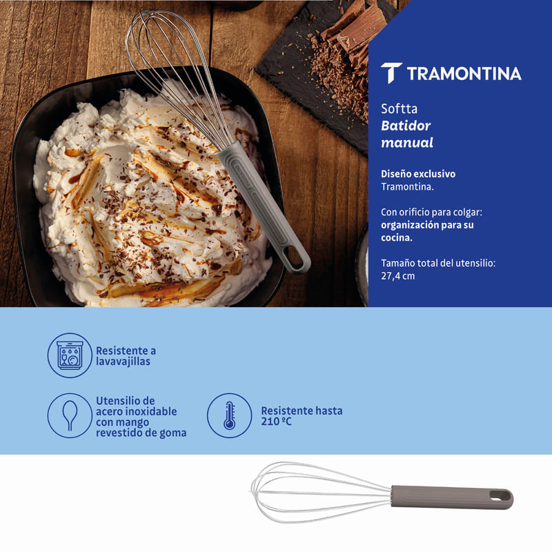 El batidor manual Tramontina Softta en acero inoxidable con mango revestido de goma gris es un artículo indispensable en su cocina. Diseñado con silicona resistente a temperaturas de hasta 210 °C, es ideal para mezclar y batir los ingredientes de forma rápida y eficiente. Su color gris moderno aporta un toque elegante al ambiente, y su compatibilidad con las superficies antiadherentes facilita el uso y la limpieza. Por ofrecer calidad y durabilidad, el batidor manual de la línea Softta es la elección perfecta para sus recetas.