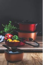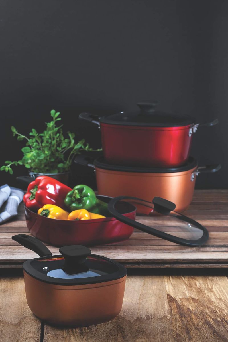 Las cacerolas de la línea Reffinatta sorprenden con su moderno diseño. Su forma cuadrada con revestimiento externo de silicona en color bronce o rojo combina a la perfección con todos los formatos de cocina. El modelo Starflon T3 es el único con tecnología T. Cuenta con más poder de antiadherencia; resistencia a la abrasión; durabilidad y mayor facilidad de limpieza.