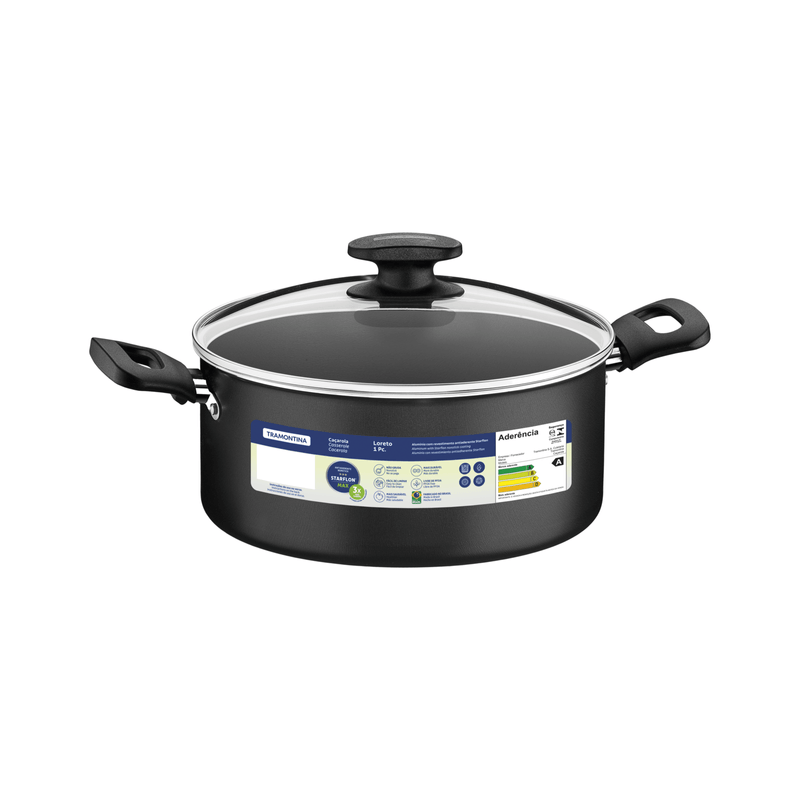 Sus recetas serán aún más prácticas al momento de ejecutarlas con la cacerola Tramontina Loreto en aluminio con revestimiento interno y externo de antiadherente Starflon Max con asas de baquelita y tapa de 22 centímetros de diámetro y 3 7 litros grafito. Producida en aluminio con revestimiento de antiadherente Starflon Max interno y externo, posee espesor que permite la cocción rápida y uniforme de los alimentos, más durabilidad y facilidad en la limpieza. Para su seguridad, las asas son de baquelita antitérmica, que no calienta y son más cómodas durante el manejo. Posee tapa de vidrio templado con bordes de acero inoxidable. Es además muy resistente, durable, muy fácil de limpiar y apta para lavavajillas. La mejor elección para perfeccionar sus habilidades en la cocina y transformarse en un gran maestro de la gastronomía!