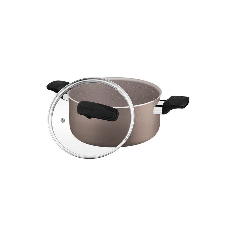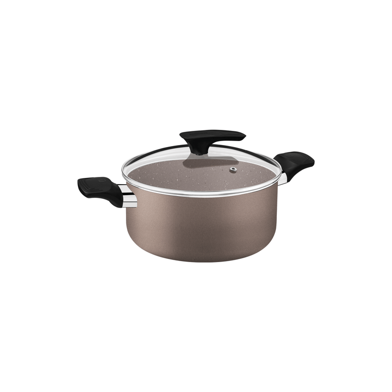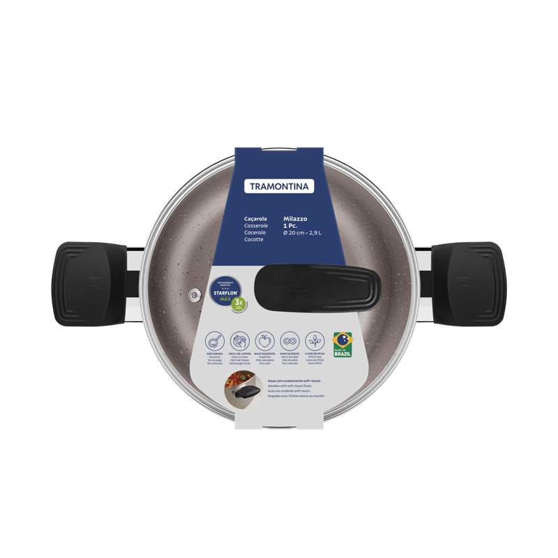 La cacerola Tramontina Milazzo en aluminio con revestimiento interno y externo en antiadherente Starflon Max almendra de 20 centímetros de diámetro es la elección ideal para preparar sus comidas con practicidad. Fabricada en aluminio con un revestimiento antiadherente de Starflon Max, evita que los alimentos se peguen y facilita la limpieza. Sus asas de baquelita antitérmica con acabado softtouch brindan confort y seguridad durante el uso. La acompaña una tapa de vidrio templado con salida de vapor y borde de acero inoxidable, que permiten visualizar la preparación de los alimentos sin perder calor. Se puede usar en cocinas a gas, eléctricas y vitrocerámicas, lo que ofrece una gran versatilidad y eficiencia. Incorpore un toque de calidad e innovación en su cocina con Tramontina!