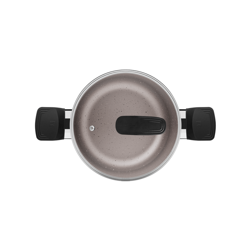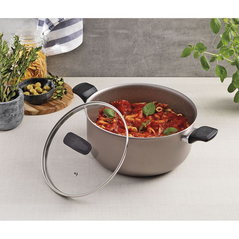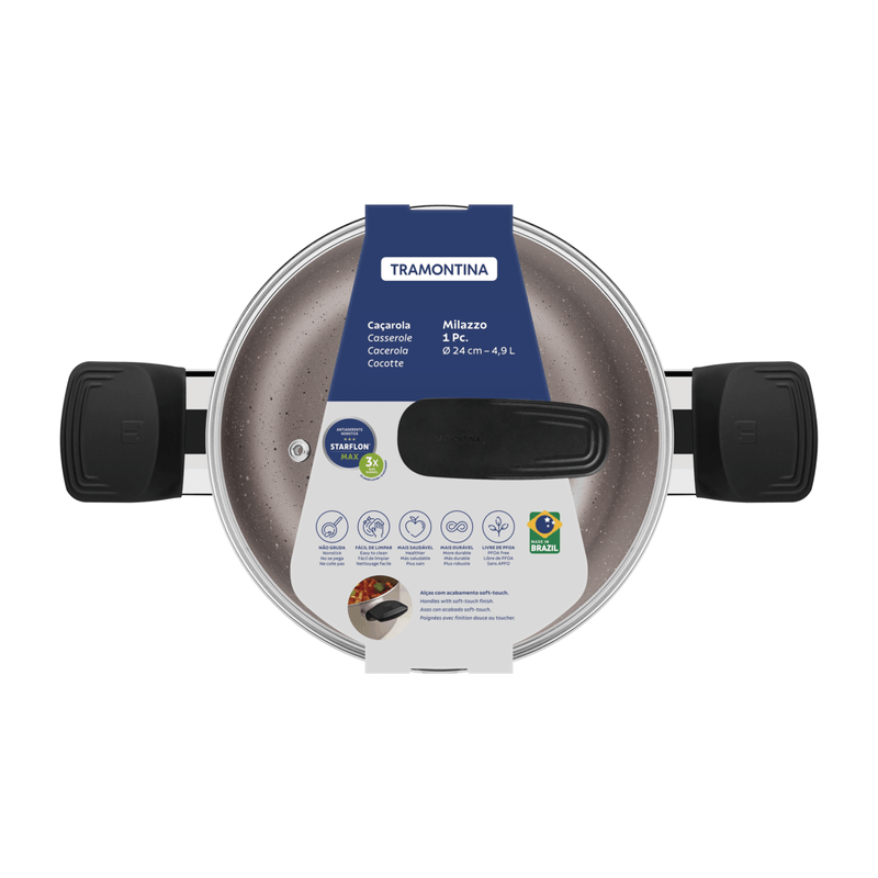 Con la cacerola Tramontina Milazzo en aluminio con revestimiento interno y externo en antiadherente Starflon Max almendra de 24 centímetros de diámetro, sus recetas quedan aún más sabrosas. Producida en aluminio con un revestimiento antiadherente de Starflon Max, permite una cocción rápida y uniforme, además de ser fácil de limpiar y evitar que los alimentos se peguen. Sus asas de baquelita antitérmica con acabado softtouch ofrecen seguridad y comodidad durante el uso. Incluye una tapa de vidrio templado con salida de vapor y borde de acero inoxidable, que permiten visualizar la preparación de los alimentos sin perder calor. Se puede utilizar en cocinas a gas, eléctricas y vitrocerámicas, siendo una pieza versátil e indispensable en la cocina. Disfrute de una experiencia culinaria superior con Tramontina!