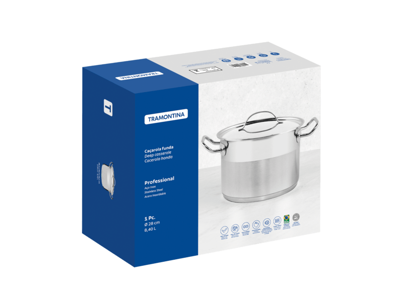 La Cacerola Tramontina honda de acero inoxidable fondo triple con tapa plana detalle satinado 28 cm de diámetro 8,4 L es ideal para el universo de los chefs de cocina, sea profesional o apenas por hobby. Con esta cacerola será posible realizar grandes preparaciones, garantizando una cocción uniforme de todos los ingredientes y sin alterar el sabor. Está hecha de acero inoxidable, material que no libera residuos que puedan perjudicar los alimentos. Para garantizar su desempeño, el fondo triple (acero inoxidable + aluminio + acero inoxidable) distribuye el calor por toda la extensión de la olla. La línea Professional de Tramontina fue pensada para atender las necesidades de quien le encanta preparar los más increíbles platos.