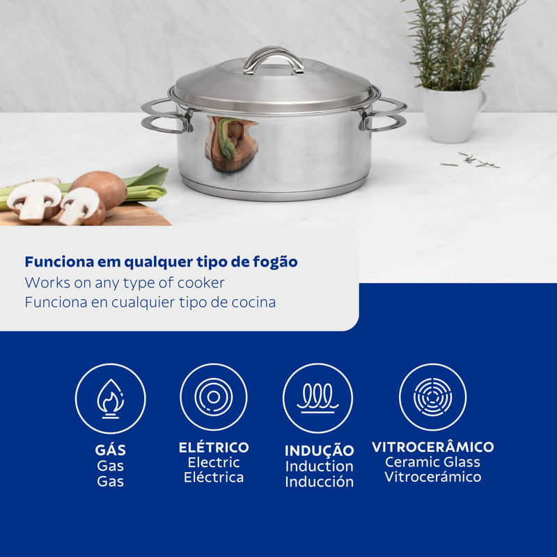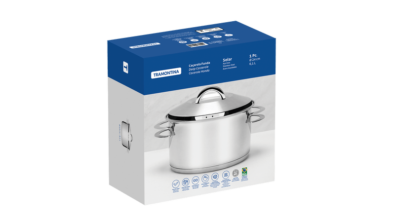 La cacerola honda de acero inoxidable con fondo triple con tapa y asas 24 cm de diámetro 6,1 L es perfecta para todo tipo de cocción. Hará que su cocina sea aún más completa. La cacerola honda de Tramontina es proyectada por la línea Solar y ofrece practicidad con un diseño que brillará en la mesa a la hora de servir, pero no brillará más que su receta. Hecha de acero inoxidable con fondo triple (acero inoxidable + aluminio + acero inoxidable), ofrece una cocción uniforme de los alimentos, además de mantenerlos calientes por más tiempo. Por su parte interna ser de acero inoxidable, no suelta ningún tipo de residuo, haciendo que el sabor sea natural y los alimentos se mantengan sanos. Basta elegir la receta y aventurarse en la cocina.