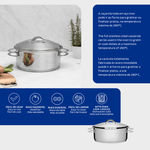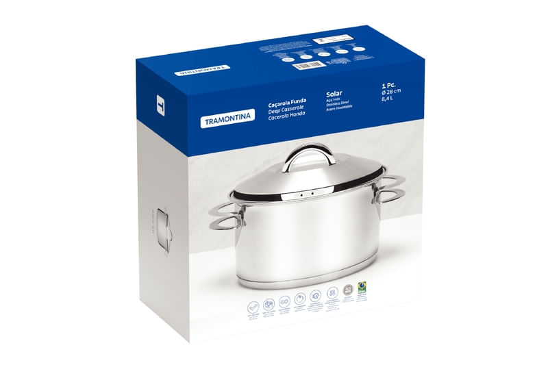 Prepare recetas llenas de sabor con la cacerola Tramontina honda de acero inoxidable fondo triple con tapa y asas 28 cm de diámetro 8,4 L de la línea Solar. Con una buena olla usted puede hacer numerosas recetas y explorar su lado gastronómico, sea para realizar recetas que ya existen o para crear una nueva. Hecha de acero inoxidable con fondo triple (acero inoxidable + aluminio + acero inoxidable), será posible que el calor sea distribuido de forma uniforme, garantizando una cocción rápida, además de mantener los alimentos calientes por más tiempo. Extremadamente funcional, puede ser utilizada tanto en la cocina como en el horno para finalizar platos. Y no se preocupe, sabemos que cocinar puede ser agotador, por esta razón, puede lavarse diariamente en lavavajillas. Con su diseño limpio y sin esquinas la limpieza es mucho más fácil. Ahora no hay más excusas para preparar esa receta que tanto le gusta.