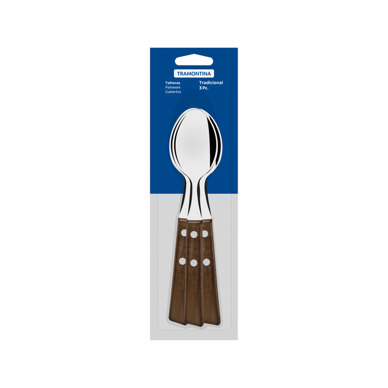 El juego de cucharas de mesa Tramontina Tradicional con láminas en acero inoxidable y mangos de madera natural de 03 piezas es perfecto para utilizarlo en comidas más calientes, como una deliciosa sopa. Las piezas están producidas con láminas de acero inoxidable y ofrecen mayor duración y resistencia. Las cucharas poseen mangos de madera natural con remaches de aluminio, que brindan el encanto y la elegancia que su cena o almuerzo merecen!