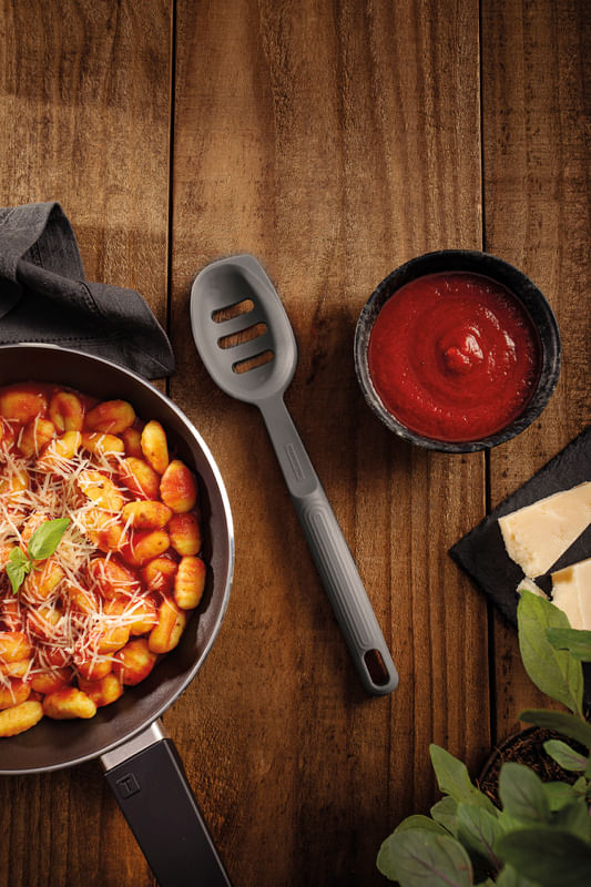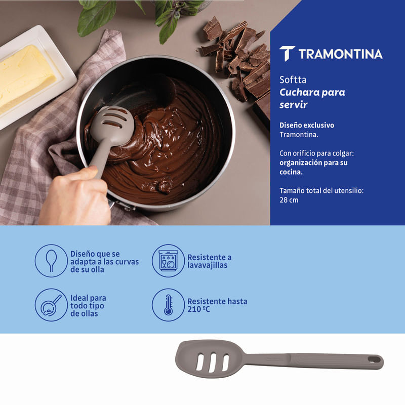 Aumente la practicidad en su cocina con la cuchara para servir abierta Tramontina Softta de silicona gris, un utensilio fundamental para quienes buscan funcionalidad y estilo al preparar y servir las comidas. Ideal para escurrir líquidos mientras sirve. Fabricada con un material resistente y durable, soporta altas temperaturas y es adecuada para usar en todo tipo de ollas. El diseño ergonómico garantiza confort durante el uso, mientras que la fácil limpieza, que permite llevarla al lavavajillas, ahorra tiempo. Con la cuchara para servir abierta puede combinar eficiencia y elegancia en cada comida.