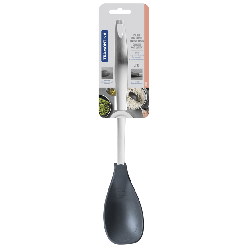 Necesita tener en su casa la cuchara para servir Tramontina Movin en nylon con mango de acero inoxidable gris. Es ligera, práctica e ideal para utilizarla en superficies con revestimiento antiadherente y cerámico, porque no las daña. La cuchara es un producto resiste y durable, que puede usarse a temperaturas de hasta 180 °C y es apta para el lavavajillas. Además, cuenta con una escala de medidas que facilita la preparación y el momento de servir sus platos preferidos. La elección correcta para usted y su casa.