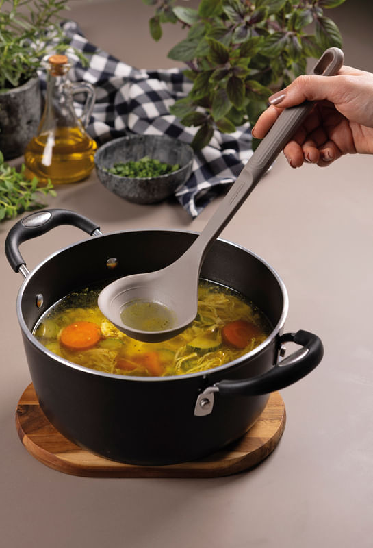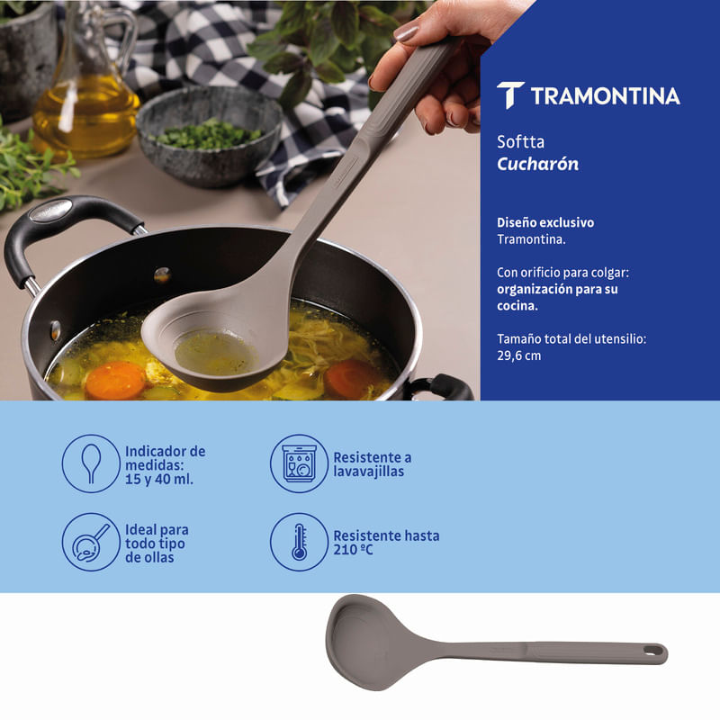 Transforme sus experiencias gastronómicas con el cucharón Tramontina Softta de silicona gris. Este utensilio combina funcionalidad y elegancia, lo que convierte la preparación y el servicio de sus comidas en un verdadero acto de estilo. Perfecto para sopas, caldos y salsas, el cucharón está fabricado en silicona de alta resistencia que soporta temperaturas de hasta 210 °C. El Cucharón Tramontina Softta es la elección ideal para quienes buscan practicidad y un toque sofisticado en cada comida.