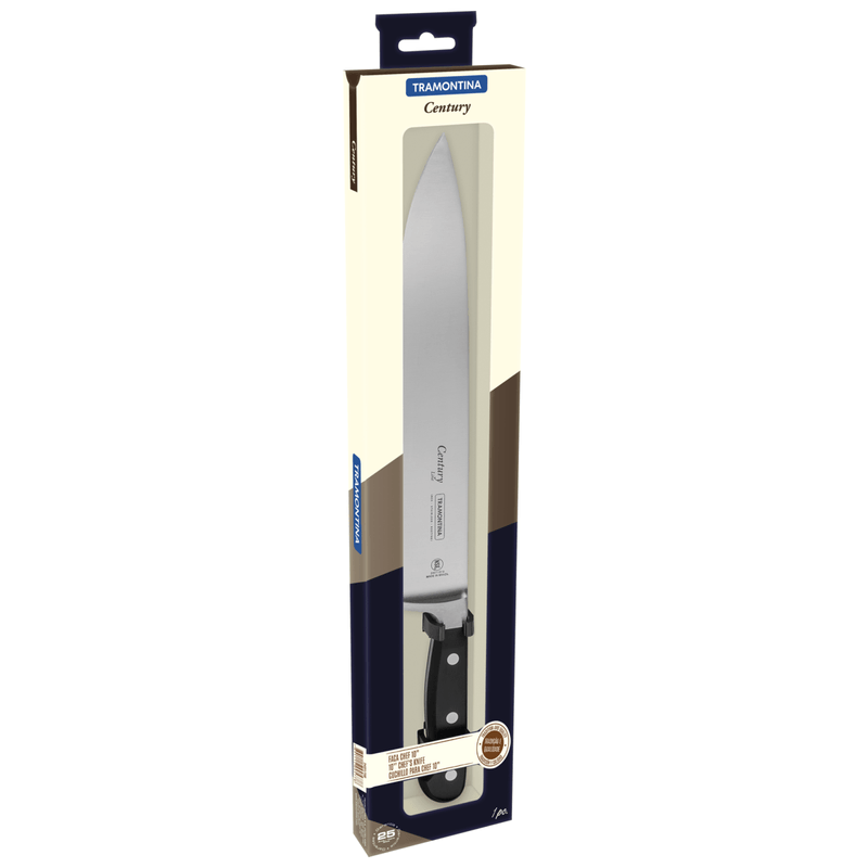 Ya sea un chef o un cocinero por hobby, garantizamos que usted entiende la importancia de un utensilio de alta calidad en su cocina. ¿No es verdad? Por eso, la línea Century presenta un cuchillo ideal para uso intenso: el cuchillo Chef Tramontina Century con lámina de acero inoxidable y mango de policarbonato y fibra de vidrio, 10 pulgadas. Una pieza única, que recibe materiales de alta calidad en su fabricación, pasando por procesos rigurosos que lo hace altamente durable, ofreciendo todavía más precisión en el corte. El cuchillo Tramontina Chef se fabrica con lámina de acero inoxidable, mango de policarbonato con fibra de vidrio. Además, recibe tratamiento térmico compuesto por templado (calentamiento de la lámina), subcero (enfriamiento de -50 a -196 °C) revenido (aumento de la flexibilidad del acero especial), proporcionándole vida larga a la lámina. Para un manejo todavía más seguro y cómodo, el mango es anatómico y ergonómico. Haga la diferencia en su cocina, elija Tramontina.