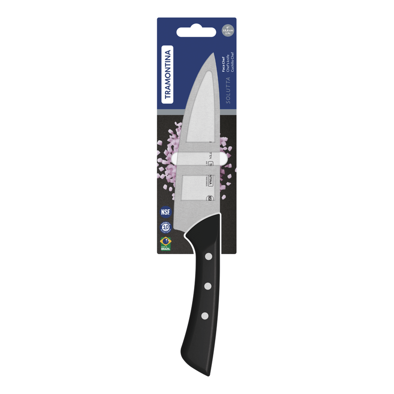 Para quienes buscan eficiencia y practicidad en la cocina el cuchillo Chef Solutta Tramontina con lámina de Acero Inoxidable y mango de Policarbonato de 6 pulgadas negro es la elección ideal. Con lámina de acero inoxidable el cuchillo garantiza un filo duradero y eficiente que es ideal para preparar una variedad de alimentos. El mango de policarbonato reforzado con fibra de vidrio brinda firmeza y seguridad en el manejo. Certificado por la NSF y resistente al lavavajillas es la elección perfecta para satisfacer las necesidades diarias con practicidad y confiabilidad.