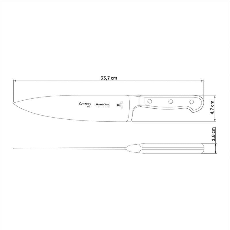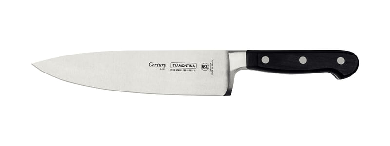 Los cuchillos de la línea Century se desarrollan especialmente para uso intenso. Reciben tratamiento térmico compuesto por templado (calentamiento de la lámina), subcero (enfriamiento de 50 a 196 grados negativos) y revenido (aumento de la elasticidad del acero) que les da vida larga y eficiente. La seguridad durante el manejo se debe a la comodidad del mango anatómico y ergonómico. De policarbonato con fibra de vidrio, se inyecta directamente sobre el alma de acero y finaliza con terminaciones de remaches de aluminio. La línea Century tiene garantía de 25 años contra defectos de fábrica y está certificado por la NSF (National Sanitation Foundation), organización reconocida internacionalmente por las prácticas de consultoría, inspección y entrenamiento, destinados a garantizar la sanidad de alimentos, agua, aire y ambiente. Se pueden lavar en lavavajillas.
