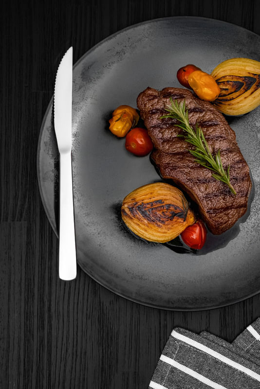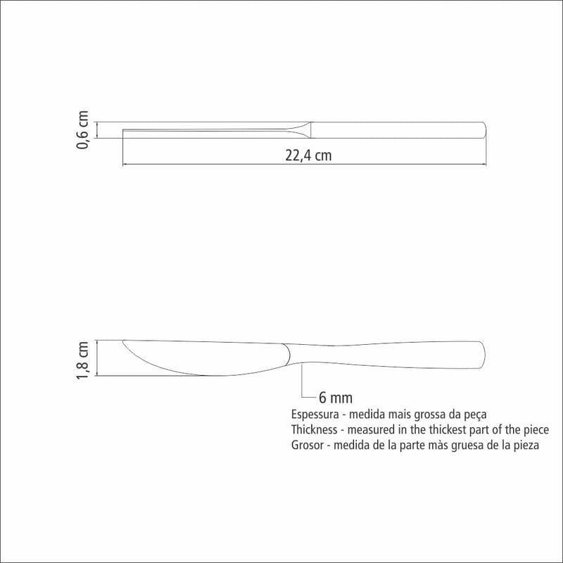 De acero inoxidable, altamente durable, mantiene las características originales, preservando la belleza, la higiene y la durabilidad del material. Cuchillo con lámina templada, que le garantiza mayor durabilidad al filo de corte y mayor resistencia a la corrosión y, por su característica de templabilidad, no araña la porcelana. Mango que se adapta mejor a la palma de la mano. Equilibrio armónico entre el mango y la lámina. Terminación en alto brillo. Se pueden lavar diariamente en lavavajillas.