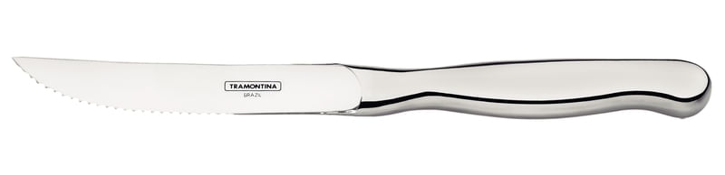 Todo buen apreciador del asado y de la carne sabe la importancia de un cuchillo de alto desempeño. El cuchillo para asado Tramontina Jumbo con lámina de acero inoxidable y filo dentado, cuenta con un diseño sofisticado y lleva elegancia a la mesa, Hecho totalmente de acero inoxidable, proporciona alta durabilidad. Contando con una lámina templada y dentada, el filo de corte se hace todavía más durable y resistente a la corrosión. Además, por ser templado, no araña la porcelana. El cuchillo trae un manejo agradable, porque se adapta mejor a la palma de la mano. Preparar y saborear un buen corte de carne ahora es más fácil.