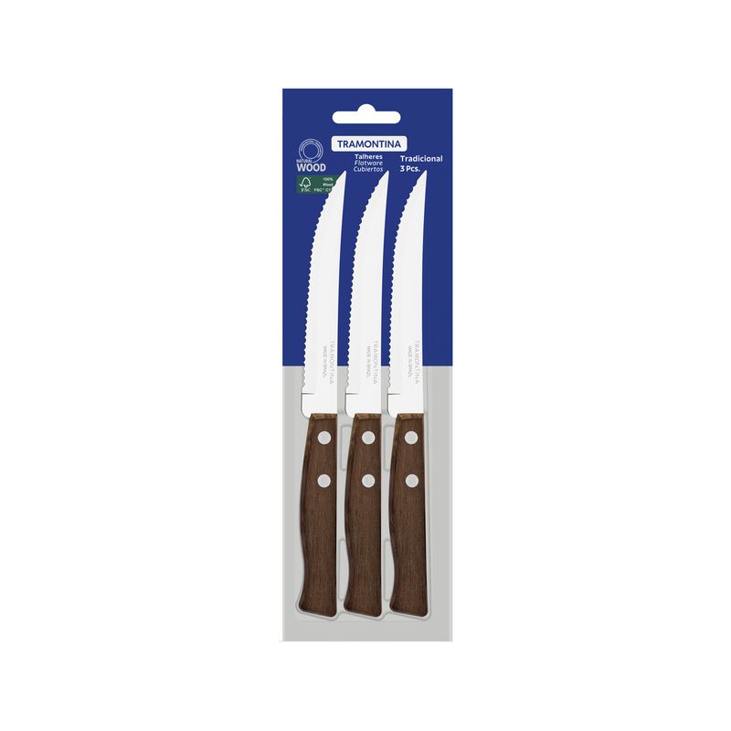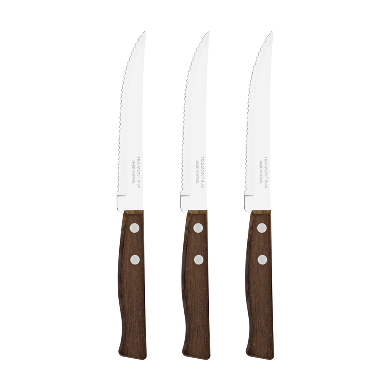 Con el juego de cuchillos para asado y frutas Tramontina Tradicional con láminas de acero inoxidable y mangos de madera natural de 03 piezas obtendrá los cubiertos ideales para utilizar tanto en asados como para cortar y pelar frutas diariamente. Los cuchillos están fabricados con láminas de acero inoxidable, que ofrecen más resistencia en el hilo de corte, y mango de madera natural con remaches de aluminio, que garantizan duración y un encanto especial a su mesa. Belleza y elegancia es con los cubiertos de Tramontina!