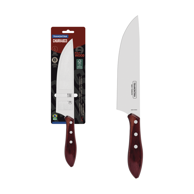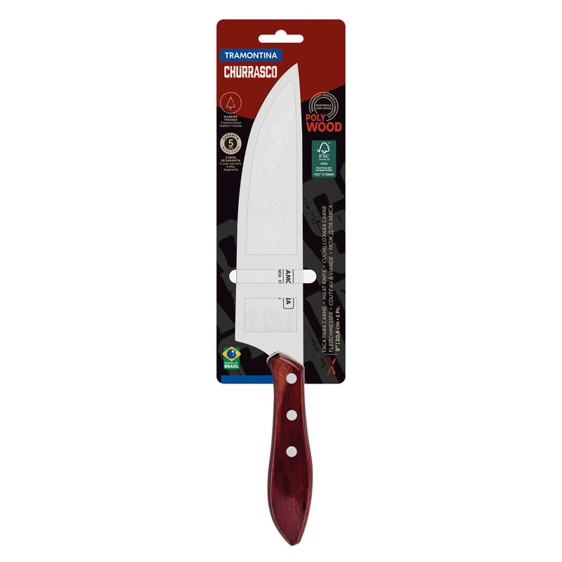 El cuchillo para carne Tramontina con lámina de acero inoxidable y mango de madera tratada Polywood rojo de 8 pulgadas es la elección ideal para distinguirse. Una pieza con un diseño destacado y funcional, que ofrece belleza para cualquier ocasión y permite realizar cortes perfectos. Su lámina está fabricada en acero inoxidable, altamente duradero, y posee un excelente poder de corte. Su mango es de madera tratada Polywood, un material exclusivo que garantiza un manejo cómodo, además de ser resistente a impactos y altas temperaturas. El cuchillo de la línea Churrasco hará que su momento sea aún más inolvidable y su día a día, mucho más práctico, ya que es apto para lavavajillas!