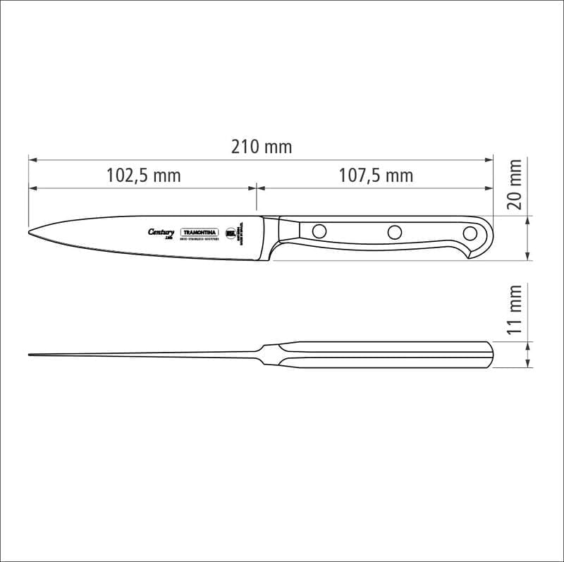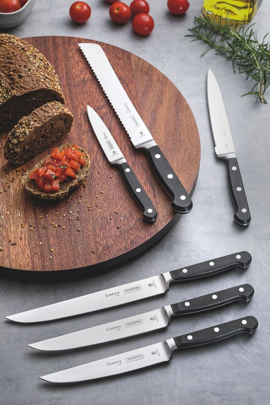 Los cuchillos de la línea Century se desarrollan especialmente para uso intenso. Reciben tratamiento térmico compuesto por templado (calentamiento de la lámina) subcero (enfriamiento de 50 a 196 grados negativos) y revenido (aumento de la elasticidad del acero) que les da vida larga y eficiente. La seguridad durante el manejo se debe a la comodidad del mango anatómico y ergonómico. De policarbonato con fibra de vidrio se inyecta directamente sobre el alma de acero y finaliza con terminaciones de remaches de aluminio. La línea Century tiene garantía de 25 años contra defectos de fábrica y está certificado por la NSF (National Sanitation Foundation) organización reconocida internacionalmente por las prácticas de consultoría inspección y entrenamiento destinados a garantizar la sanidad de alimentos agua aire y ambiente. Se pueden lavar en lavavajillas.