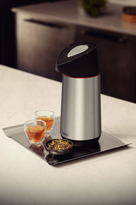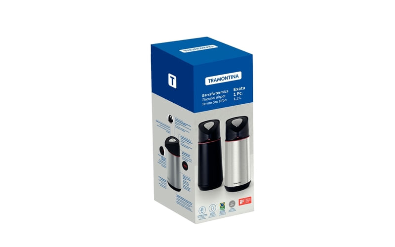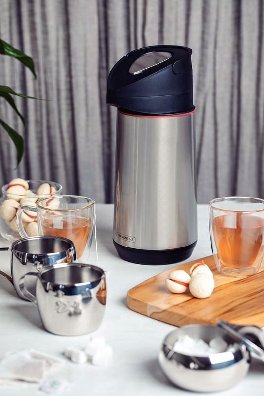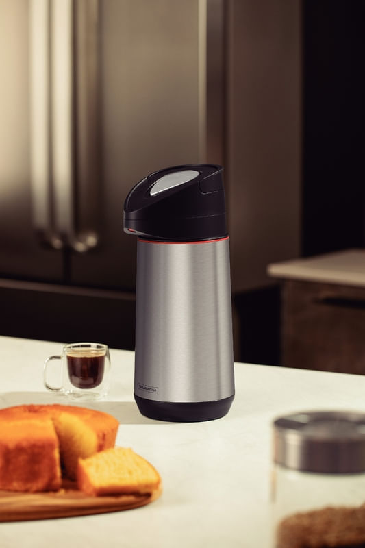 When it comes to your tea or coffee time, there is nothing better than a thermal beverage dispenser that keeps drinks hot for as long as possible, right? Tramontina's 1.2 L stainless steel thermal beverage dispenser with glass container from the Exata line does just that. You can take it anywhere as its timeless features and clean design go well in any setting. It features a built-in handle, comfortable grip and feels solid. It?s easy to pull the handle out and the push button for the pump is stainless steel. In addition, the dispenser has a drip-free system which prevents it from dripping after serving. This strong, simple and modern thermal beverage dispenser takes up less room in your home and during transport. It is also lightweight and easy to use, with a fingerprint-free textured finish that prevents marks. A thermal beverage dispenser with the Tramontina quality that you trust.