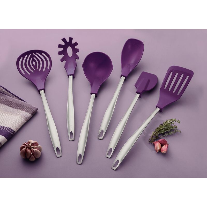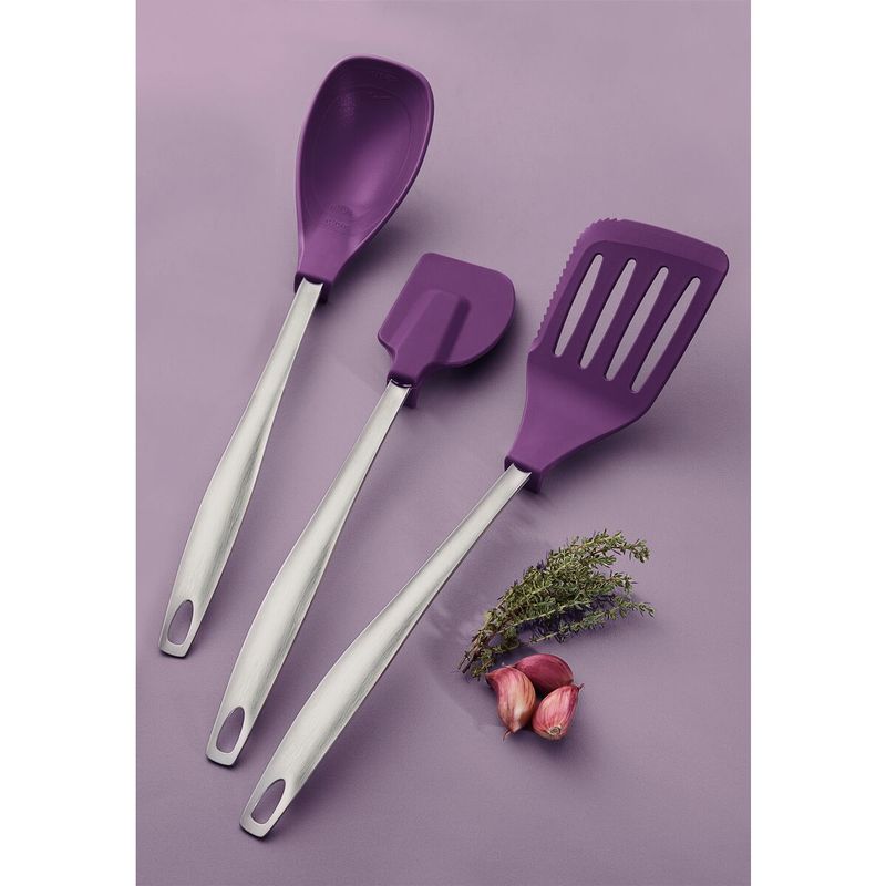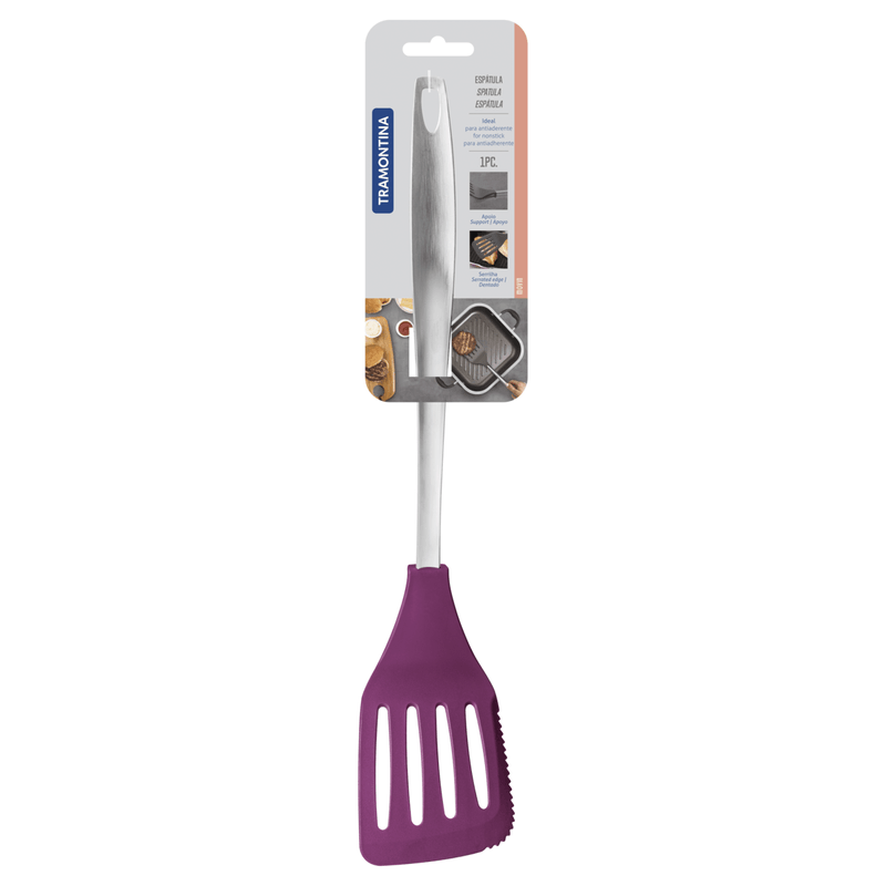 Necesita tener las mejores piezas en su cocina! La espátula con dientes Tramontina Movin en nylon con mango de acero inoxidable lila es perfecta para usted: ligera, práctica y muy resistente, para utilizarla a temperaturas de hasta 180 °C y es apta para el lavavajillas diariamente. Además, no mancha y no retiene olores. También cuenta con dientes laterales para cortes suaves y un diseño innovador en un color vibrante. Tenga esta pieza en su cocina para hacerla más moderna y funcional!