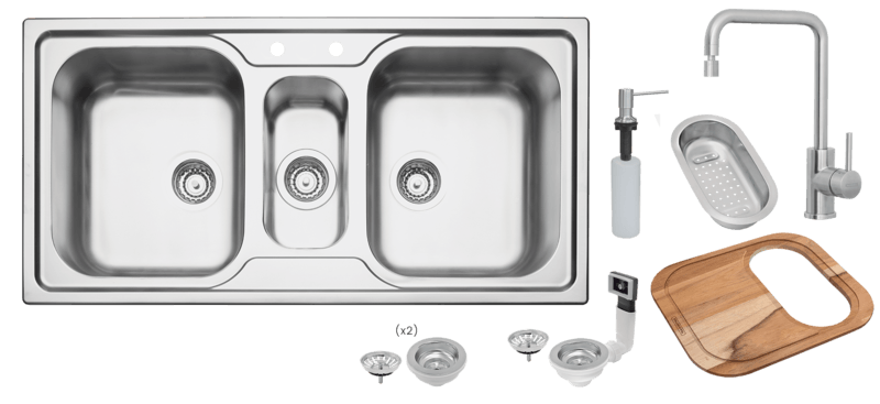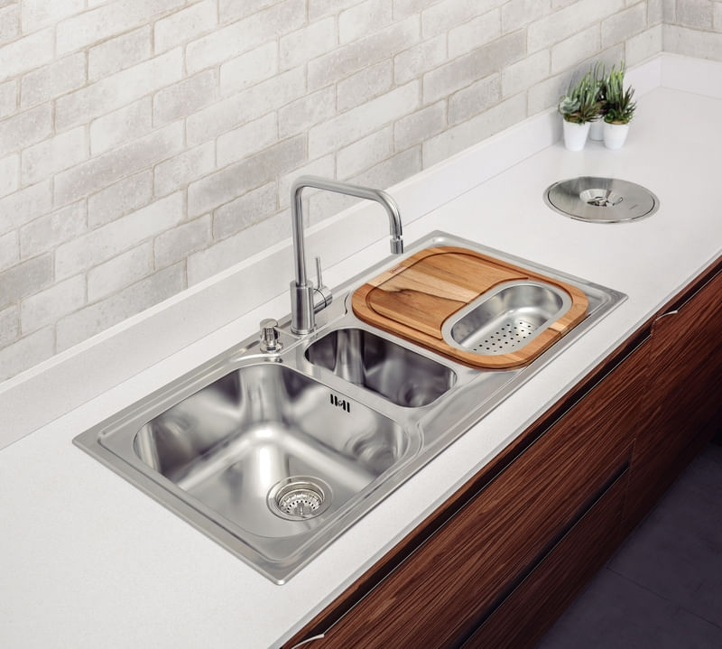 El fregadero de empotrar Tramontina Marea 2.5C 34 con 2 cubetas y auxiliar de acero inoxidable con terminación cepillado, 100 x 50 cm, con mezclador, válvula, dispensador de jabón, tabla y cesta, de la línea Prime completa el proyecto de su cocina con comodidad y requinte. Viene con válvula de 4 1/2 pulgadas - con escape y sin escape de agua, tabla de madera, dispensador de jabón, cesta colador de acero inoxidable y mezclador monocomando Angolare. Combinando practicidad y diseño moderno, el fregadero de acero inoxidable con terminación satinada ofrece amplio espacio.