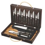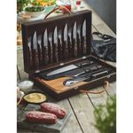 Juego de asado 17 piezas. Incluye cuchillos y tenedores para comensales, cuchilla y pinche para la parrilla. También trae tabla y estuche de madera.