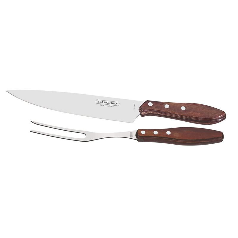 Juego para asado de dos piezas. Incluye cuchillo de carne 8", con vaina y pinche parrillero. Compuesto por láminas de acero inoxidable, cuenta con mangos de madera tratada Polywood y remaches de aluminio. El juego contiene 1 cuchillo de cocina 8", 1 tenedor trinchante.