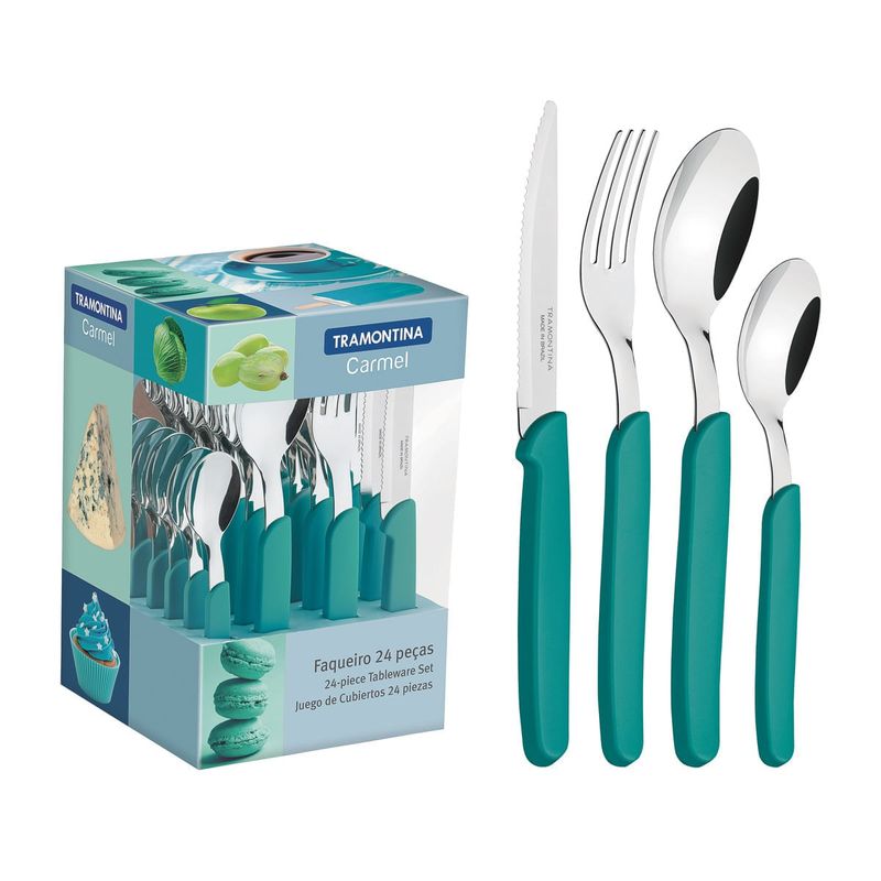 A la hora de la merienda almuerzo o cena los cubiertos de la línea Carmel le dan alegría a su día a día! Hechos de acero inoxidable con un espesor que mantiene las formas inalterables incluso con uso intenso los tenedores cuchillos y cucharas tienen mangos de polipropileno con diversas opciones de color. El filo de los cuchillos tiene más durabilidad porque las láminas reciben tratamiento térmico especial. Se pueden lavar en lavavajillas.