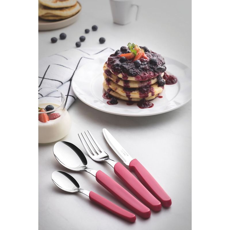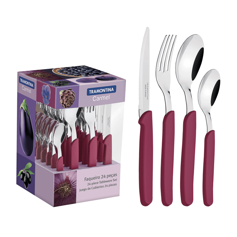Ya sea para el día a día o para una ocasión especial, el Juego de Cubiertos Tramontina Carmel con Láminas de Acero Inoxidable y Mangos de Polipropileno Ciruela 24 Piezas de la línea Carmel dejará tu mesa y los momentos de confraternización todavía más especiales. El juego de cubiertos es la opción ideal para los que buscan más encanto para su mesa. Los cubiertos se fabrican con láminas de acero inoxidable y espesor que mantienen la forma inalterada, incluso con el uso intenso, contando con mangos de polipropileno altamente durables. Los cuchillos tienen más durabilidad, porque las láminas de acero inoxidable reciben tratamiento térmico. Una opción llena de color para traerle alegría a todos los momentos. El juego contiene: 6 Cucharas de Mesa, 6 Cucharas de Té, 6 Cuchillos para Asado 4'', 6 Tenedores de Mesa.