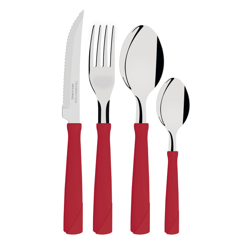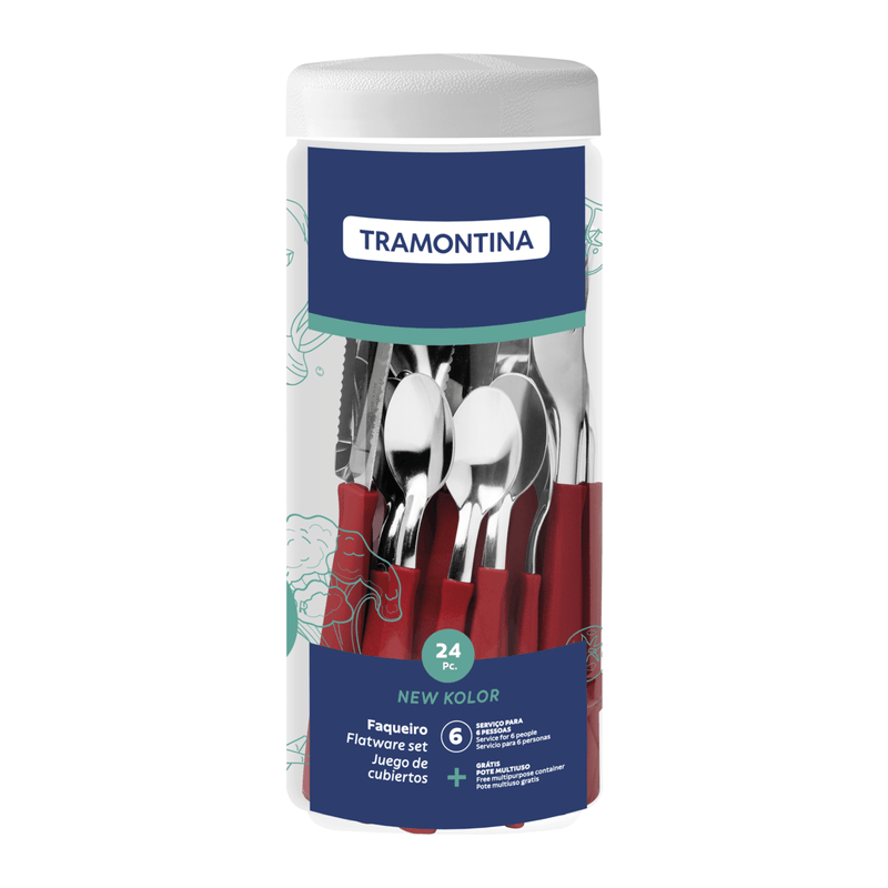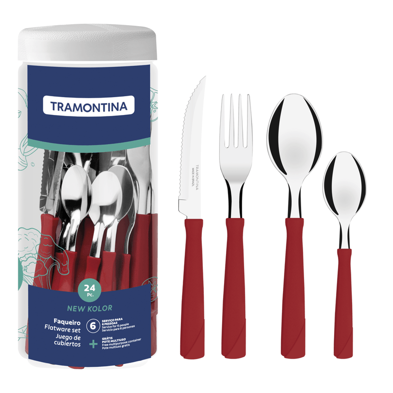 Lleve a la mesa la alegría de los colores. Los cubiertos de la línea New Kolor tienen mangos de polipropileno de colores y resistentes. Con láminas de acero inoxidable, los cuchillos, los tenedores y las cucharas tienen alta resistencia y durabilidad. Las láminas de los cuchillos reciben tratamiento térmico, lo que deriva en mayor resistencia y durabilidad del filo. Todas las piezas pueden llevarse al lavavajillas.