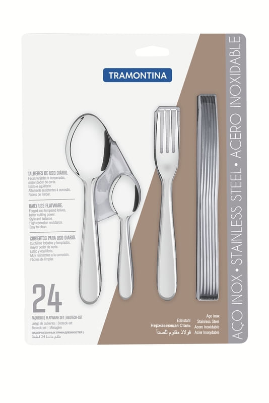 - Piezas de acero inoxidable, altamente durable, mantiene las características originales, preservando la belleza, la higiene y la durabilidad del material. - Cucharas con cuenca en formato simétrico y bordes cuidadosamente redondeados. - Tenedores con dientes pulidos en la parte interna, con formato apropiado para la boca y bordes redondeados para proporcionar más comodidad en el uso. - Cuchillos totalmente templados, que le garantiza mayor durabilidad al filo de corte y mayor resistencia a la corrosión y, por su característica de templabilidad, no araña la porcelana. - Terminación brillante, con detalle en el mango. - Apropriada para uso diario, combina con cualquier ambiente. - Se pueden lavar diariamente en lavavajillas.