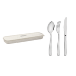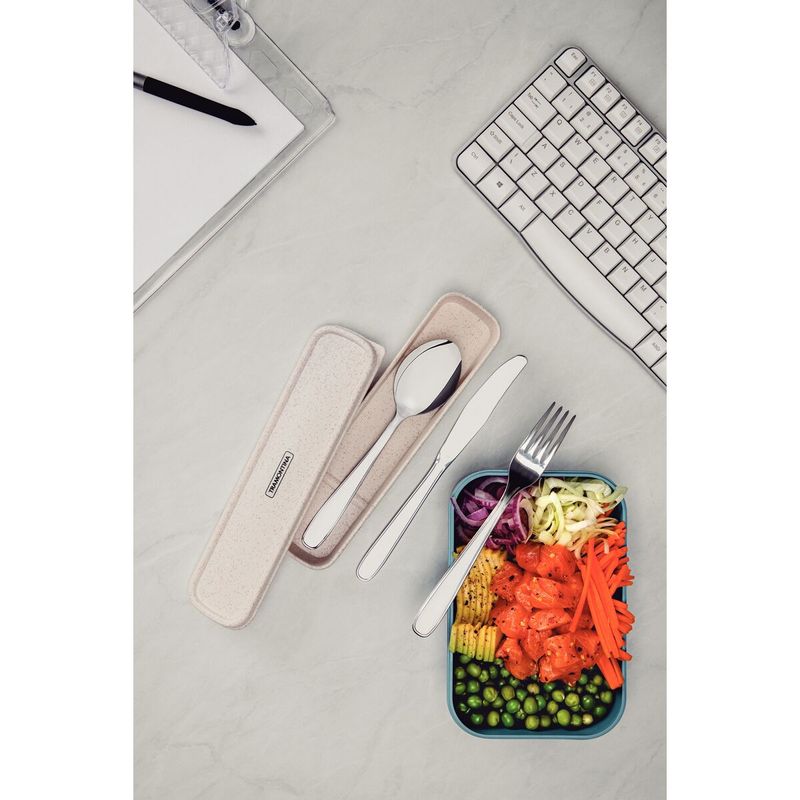 El estuche de cubiertos By Me beige 4 piezas Tramontina es la elección perfecta para su día a día. Con cubiertos básicos e indispensables como cuchara tenedor y cuchillos hechos de acero inoxidable es esencial para comer fuera de casa. Hecho con un material ecológico compuesto de fibra de trigo con polipropileno es muy liviano e ideal para cargar en su bolso o mochila. ¡Con este estuche sus comidas en el trabajo en el gimnasio o en la escuela ya no serán más las mismas! El estuche contiene: 1 Cuchara de postre, 1 Cuchillo de postre y 1 Tenedor de postre.