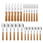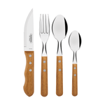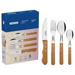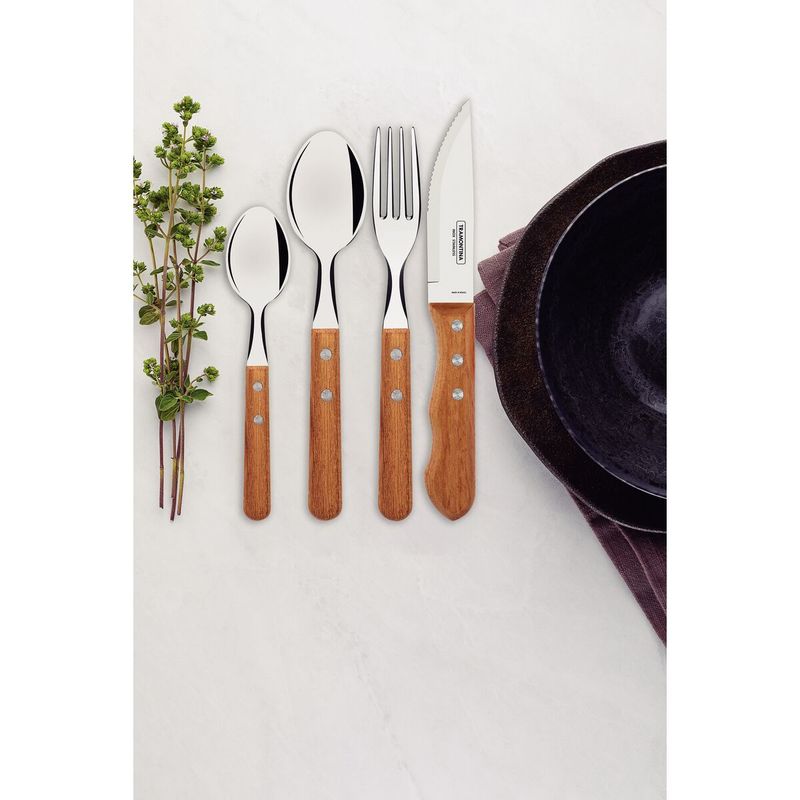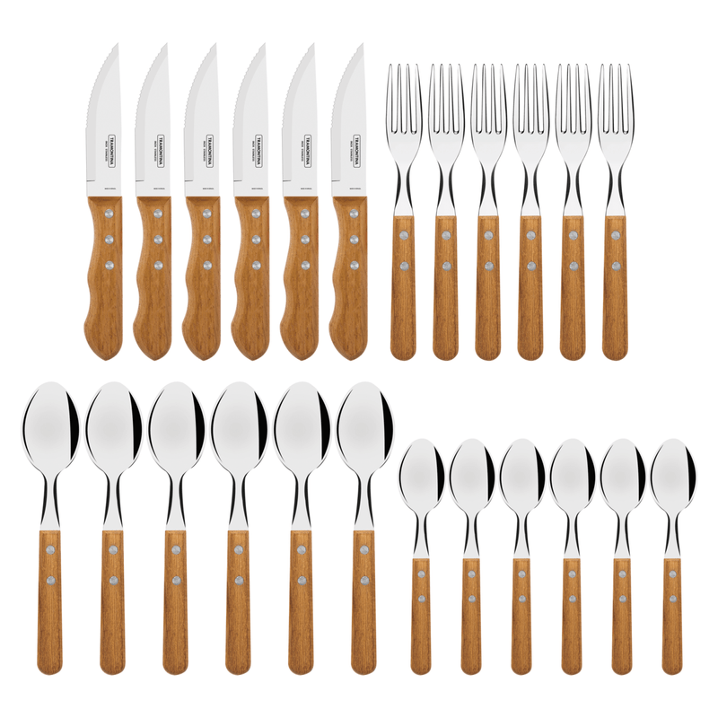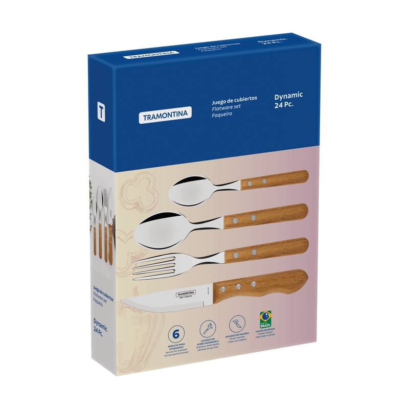 El juego de cubiertos Dynamic Tramontina con Láminas de Acero inoxidable y mangos de madera natural de 24 piezas es la elección ideal para acompañarlo en las comidas principales. Compuesto por cuchillos tenedores y cucharas fabricados con láminas de acero inoxidable y mangos de madera natural con remaches de aluminio es un juego de cubiertos resistente y duradero. Sus cuchillos garantizan un excelente hilo de corte y los tenedores y las cucharas poseen un estampado especial que proporciona resistencia y durabilidad.¡Los cubiertos son muy fáciles de limpiar y harán que su día a día sea mucho más práctico!