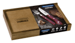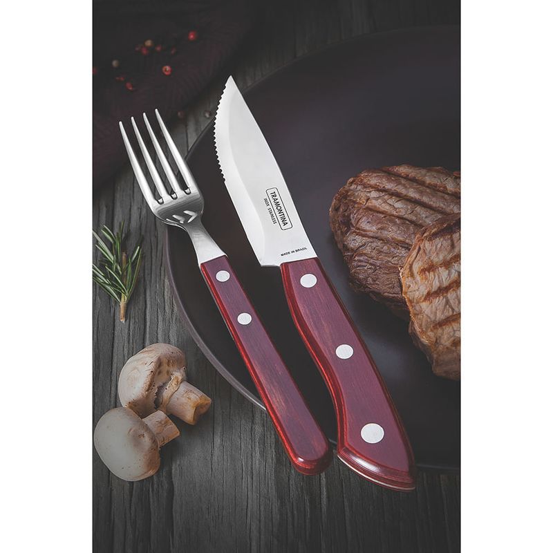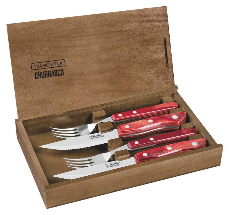 Juego de Cubiertos para Asado 4 piezas. Incluye 2 tenedores para asado y 2 cuchillos 5” Pampa filo liso. Las láminas son de acero inoxidable, los mangos de madera tratada Polywood y los remaches de acero inoxidable.