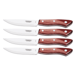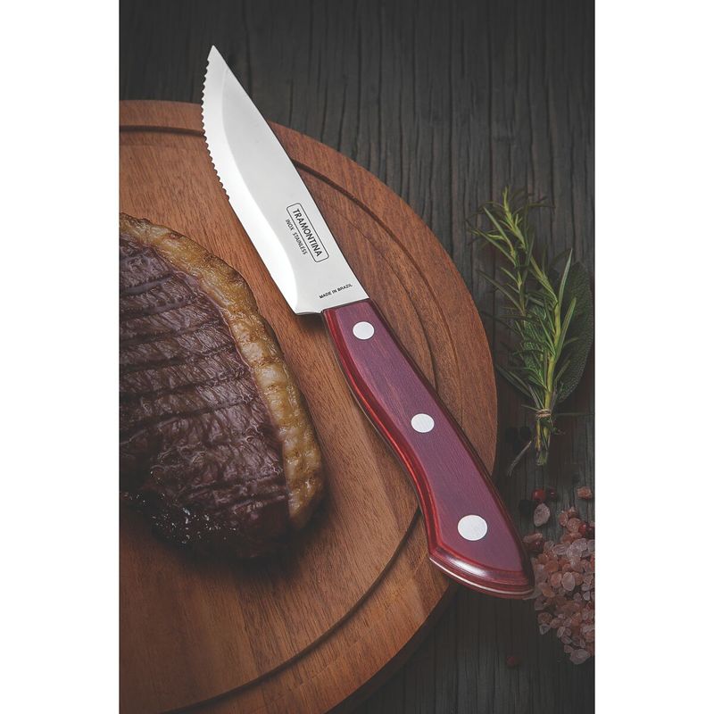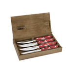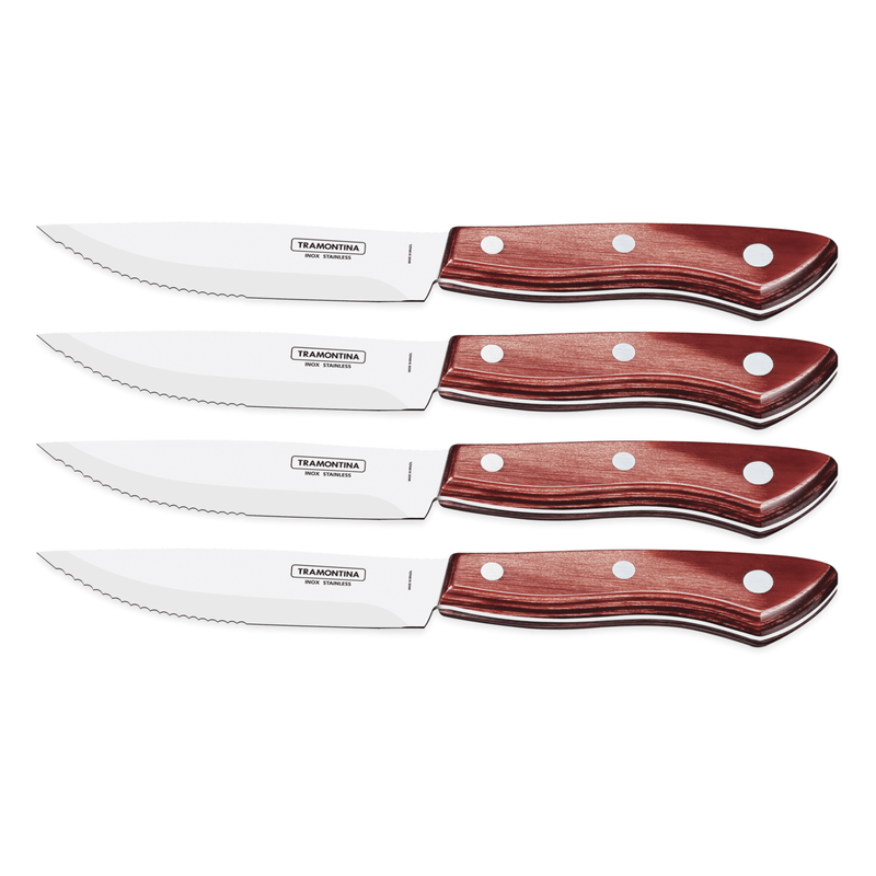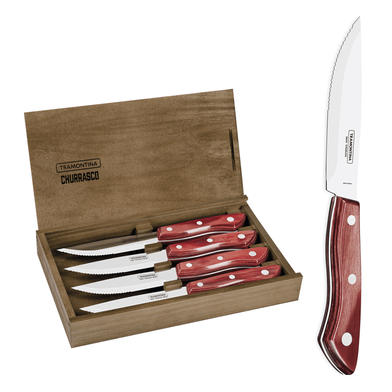 No es cualquier cuchillo que está a la altura de su asado. El juego de cuchillos para asado Bueno Tramontina con láminas de acero inoxidable con mango de polywood rojo y estuche de madera, 4 piezas, sabe bien eso. Los cuchillos para asado jumbo se fabrican con láminas de acero inoxidable y mangos de madera tratada polywood, resistentes a impactos y altas temperaturas, con remaches de acero inoxidable. La calidad y la belleza que su asado merece están en este completo conjunto de la línea Churrasco de Tramontina.