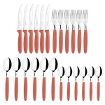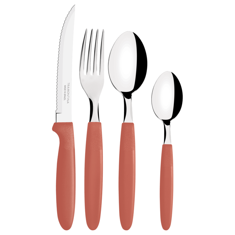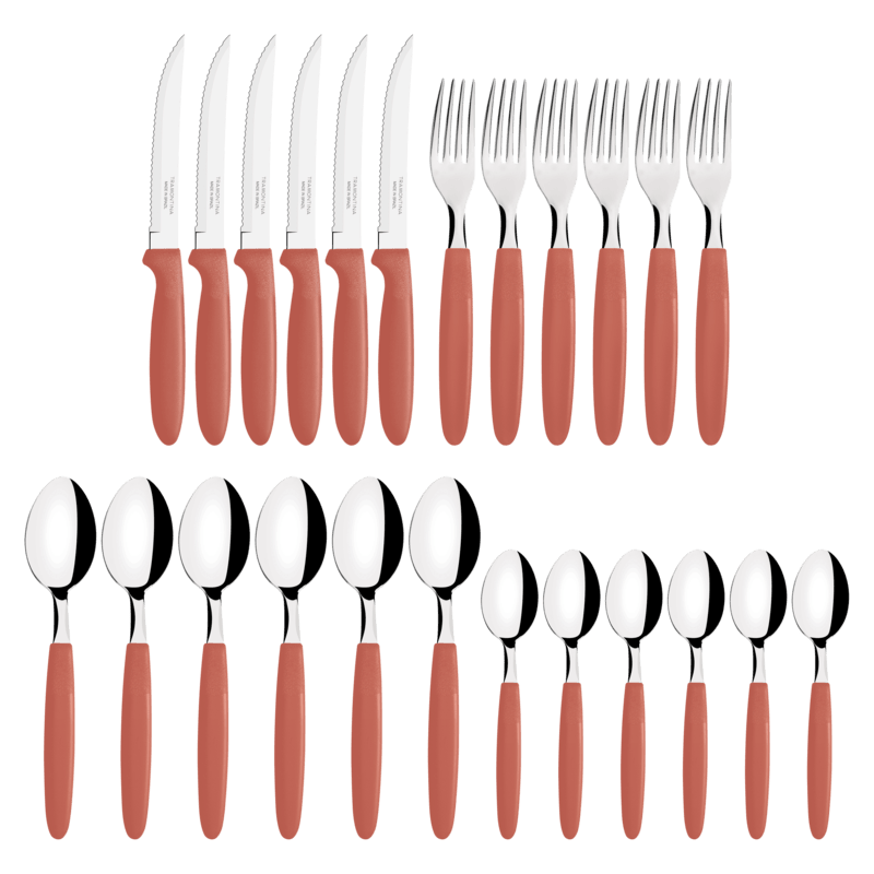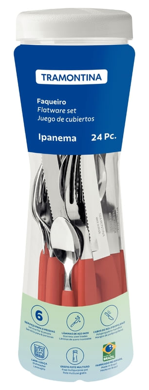 Deja tus comidas todavía más atractivas y alegres con el Juego de Cubiertos Tramontina Ipanema de Acero Inoxidable y Mangos de Polipropileno Guayaba 24 Piezas. Tiene piezas con láminas de acero inoxidable y mangos de polipropileno color guayaba, ambas características que proporcionan más durabilidad y resistencia, además de dejar tu mesa todavía más bonita y colorida. Además es muy fácil de limpiar y se puede lavar en el lavavajillas y viene, además de venir con un pote plástico ideal para almacenar y guardar tus piezas o alimentos.