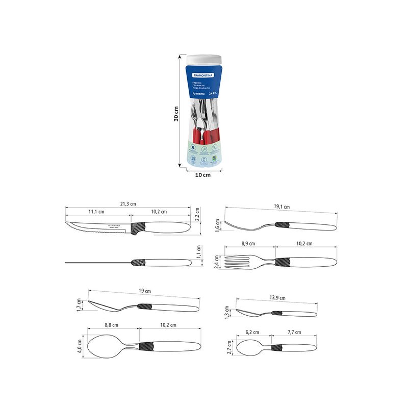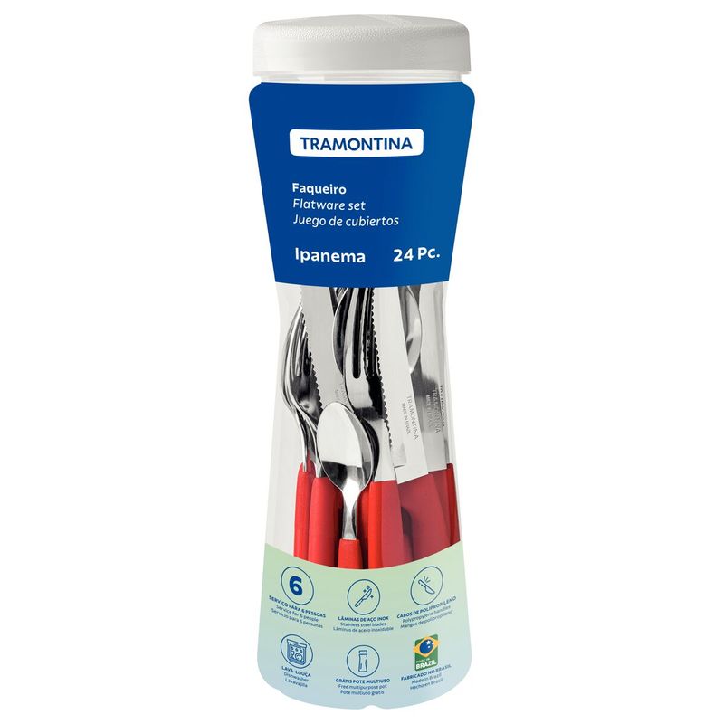 ¿Qué tal agregarle color y alegría a tu día a día? Con el juego de cubiertos Tramontina Ipanema con láminas de acero inoxidable y mangos de polipropileno rojo con pote plástico 24 piezas tus momentos agradables a la mesa estarán garantizados. Con él, tendrás mucha versatilidad y calidad para todas tus comidas, porque sus piezas se fabrican con láminas de acero inoxidable y mangos de polipropileno, características que garantizan alta resistencia y durabilidad. Además, viene con un pote plástico, perfecto para guardar sus piezas o alimentos como fideos u otros granos. Lleva toda esa practicidad a tu casa y cuenta con la calidad Tramontina.