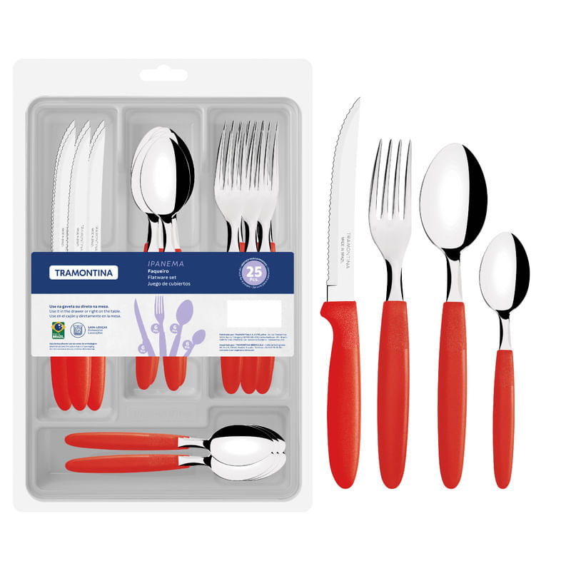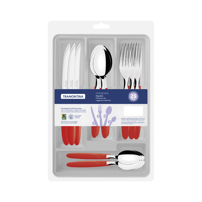 El juego de cubiertos Tramontina Ipanema con láminas en acero inoxidable y mangos de polipropileno rojo con cajonera plástica 25 piezas combina practicidad con un aspecto vibrante para el día a día. Las láminas en acero inoxidable ofrecen resistencia y durabilidad, mientras que los mangos de polipropileno rojo garantizan comodidad y un toque de color en la mesa. La cajonera plástica mantiene los cubiertos organizados con mayor facilidad. Una elección funcional y llena de estilo.